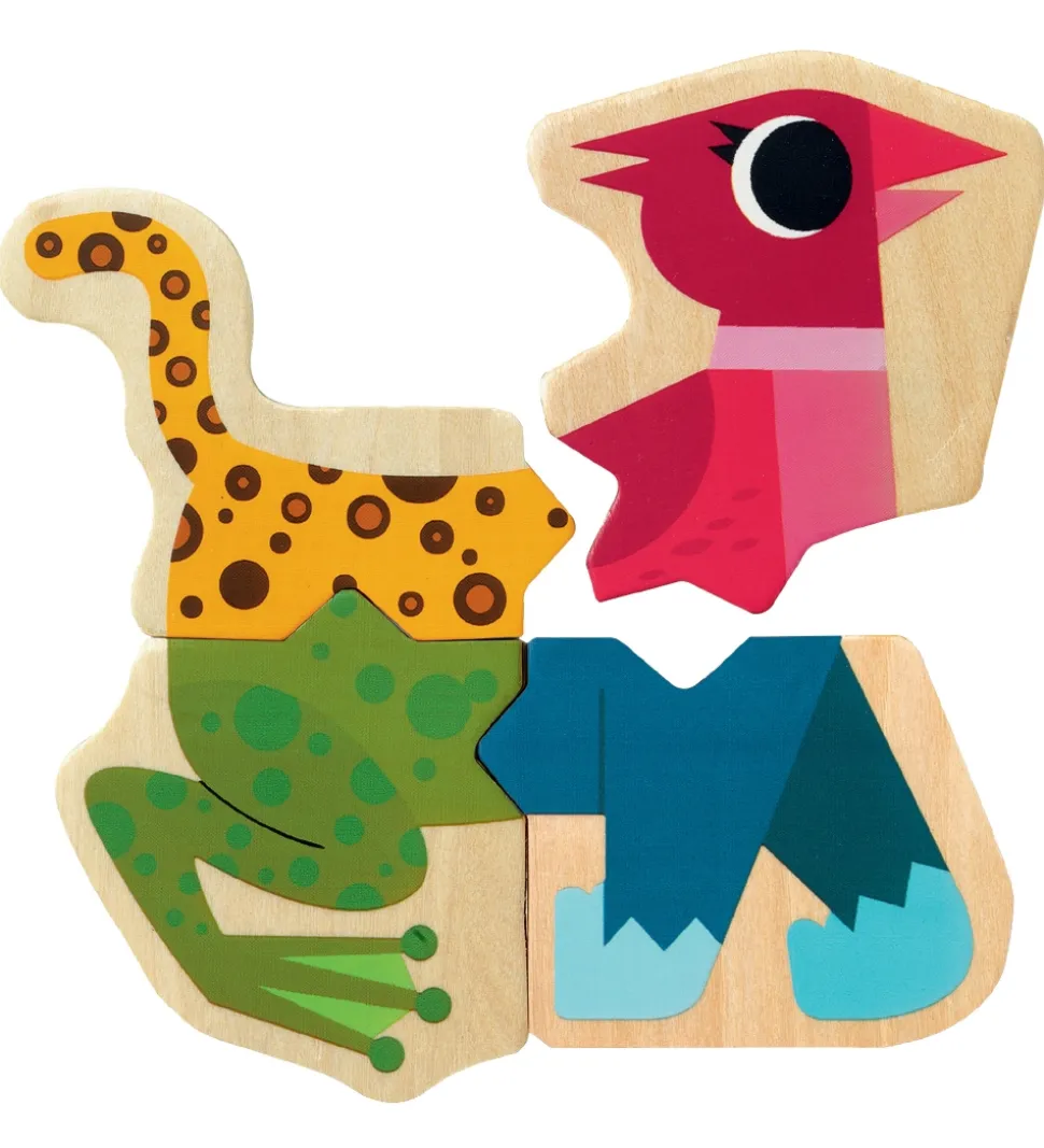 Djeco magnetpuslespillet består af i alt 24 brikker med motiverne af forskellige dyr, blandt andet en frø og en panda. Brikkerne har de samme former i de sider, der sidder sammen, så man kan sætte dele fra forskellige dyr sammen. Hver brik er magnetisk, så de kan sættes op på en magnetisk tavle eller køleskabet.