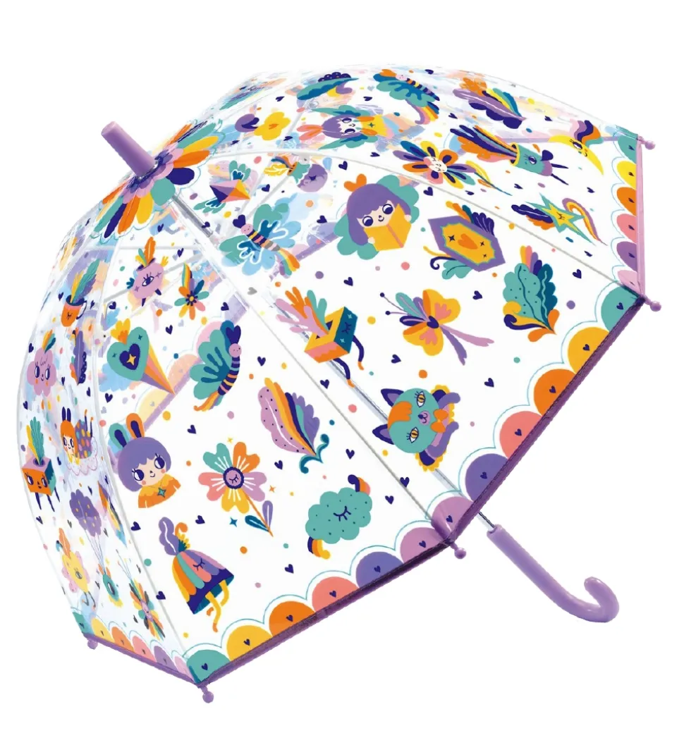 Skøn Djeco paraply i gennemsigtigt, blødt plast med print af regnbuer, skyer og feer og med et lilla håndtag.