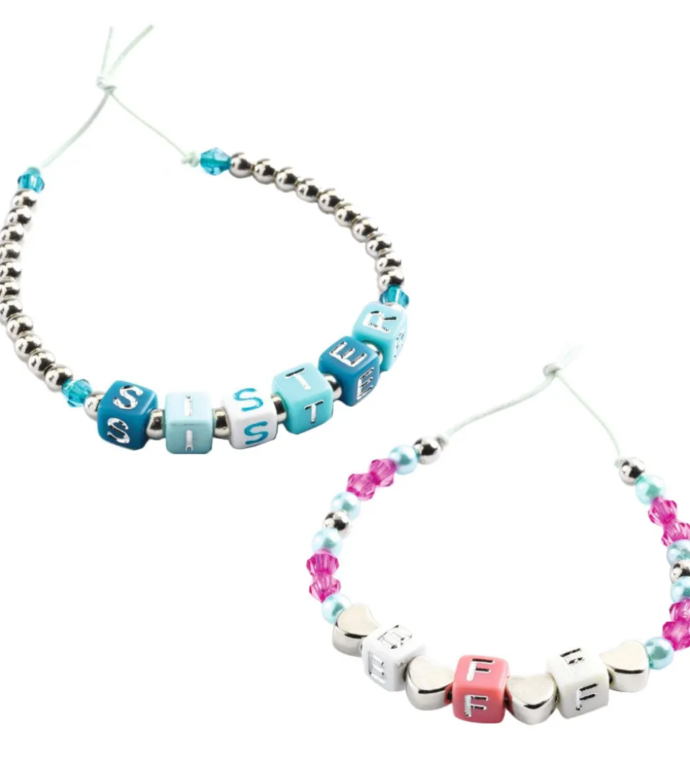 Skønne Djeco alfabet-perler, der har form som små terninger i forskellige blå nuancer, rosa og hvid samt med bogstaver på i sølv og lyseblå.