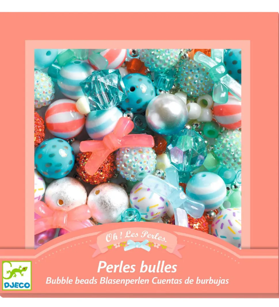 Skønne Djeco boble-perler med masser af mønstre, strukturer og farver som sølv, mint. lyseblå, hvid og rosa.