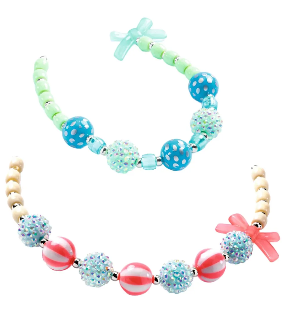 Djeco sættet består af flere end 200 perler samt elastiksnore og små, guldfarvede vedhæng, så børn kan lave deres egne halskæder og armbånd i massevis.