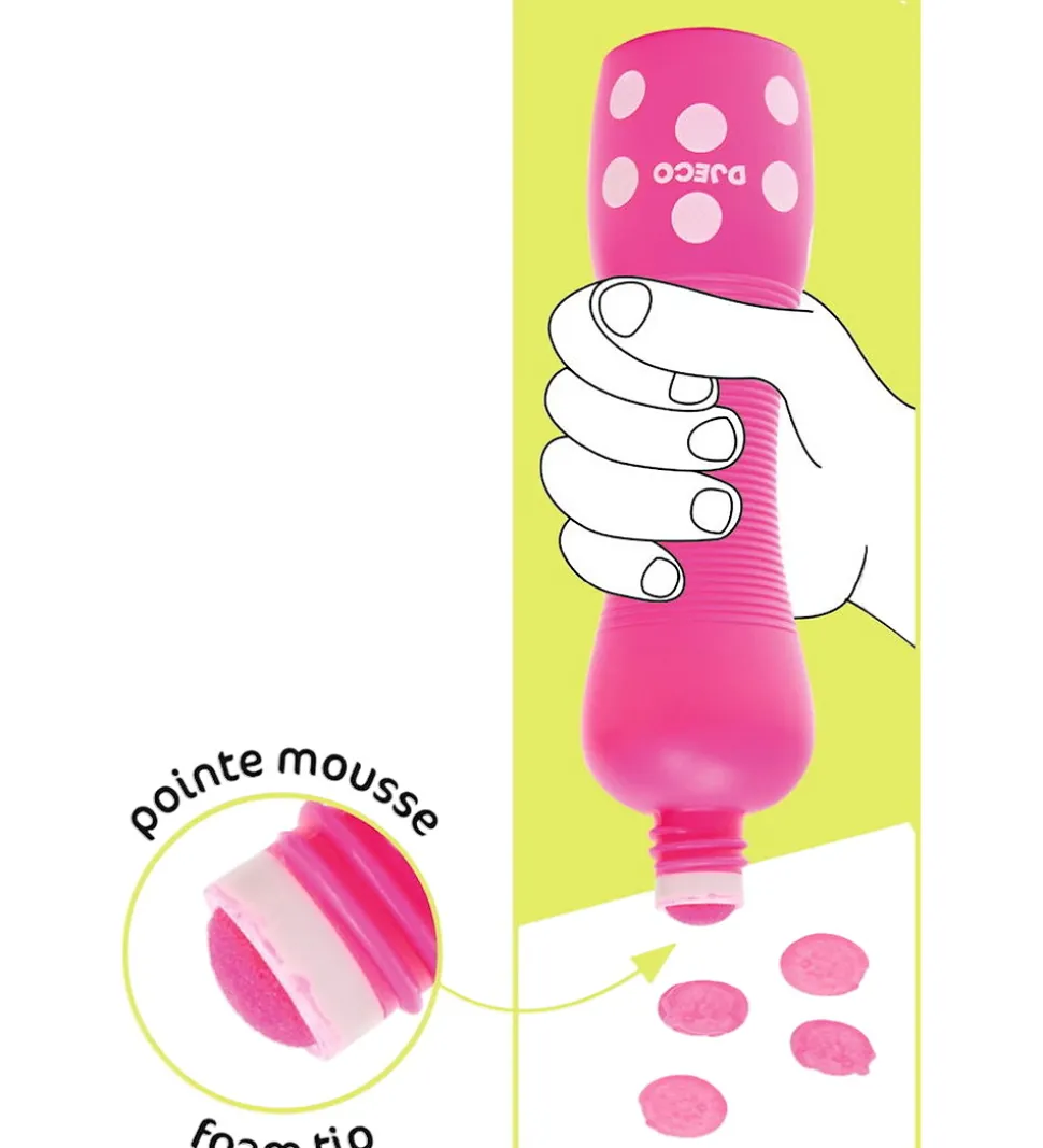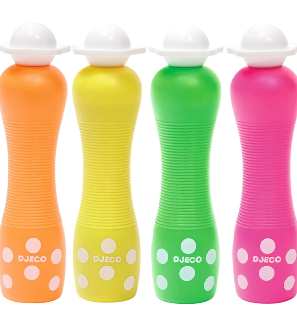 Skønne Djeco prikmarkører i orange, gul, grøn og pink. Djeco markørerne er designet til små hænder og gør det nemt at skabe farvestrålende kunstværker med store prikker.