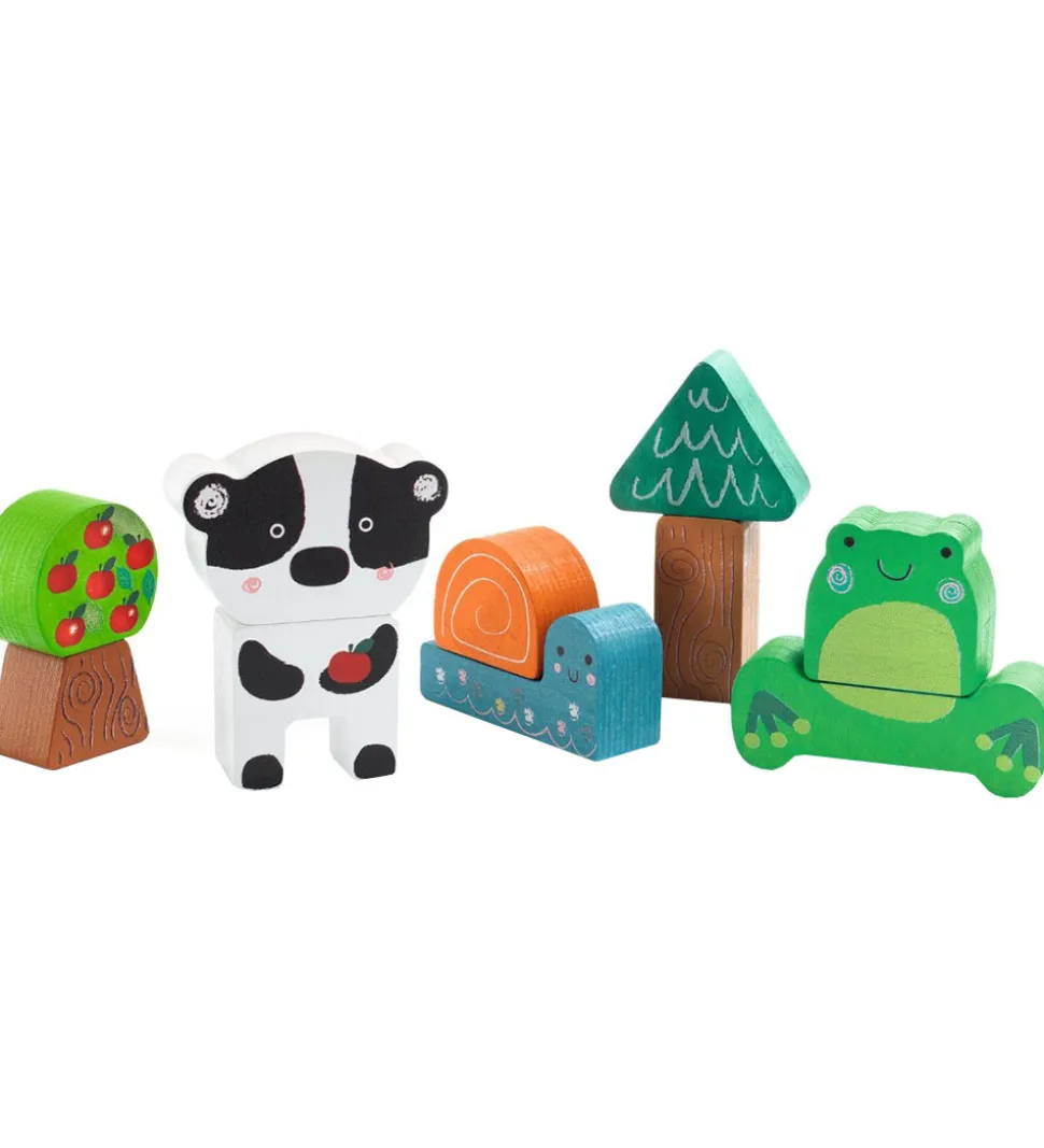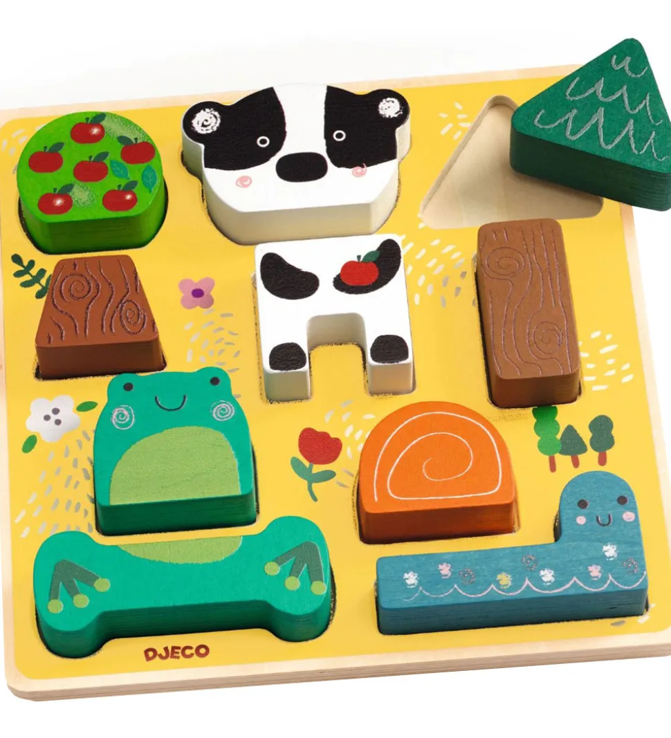Djeco puslepillet består af ti brikker og en firkantet plade med fordybninger, som brikkerne passer ned i. Hver brik stikker op over kanten af pladen, så det er let for det lille barn at gribe fat om brikkere. Brikkerne kan også stables på hinanden, så de små kan lege på forskellige måder.