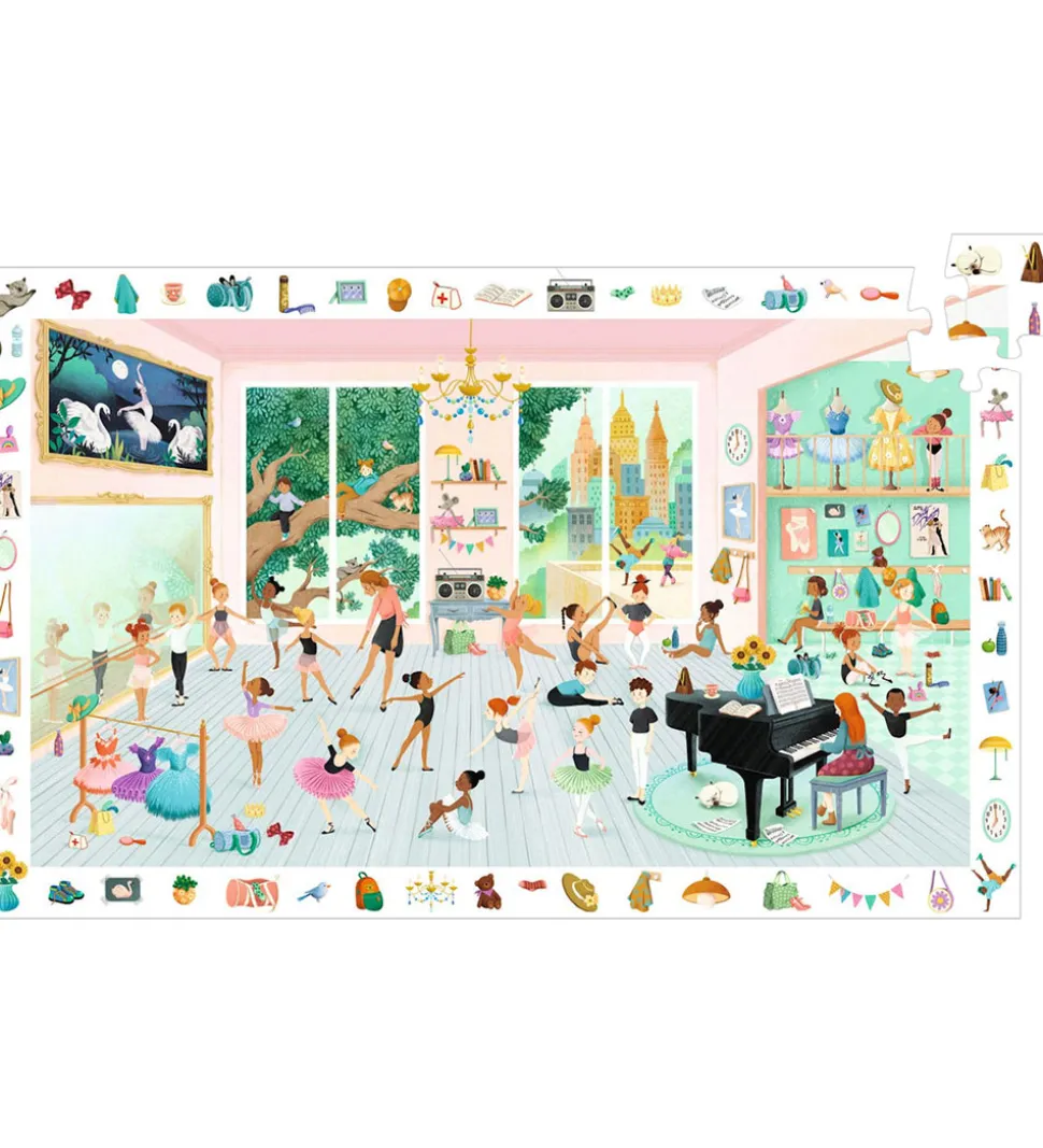 Underholdene Djeco puslespil med motiv af balletundervisning, som har en masse forskellige motiver gemt i puslespillet, som man kan finde når puslespillet er lagt.
