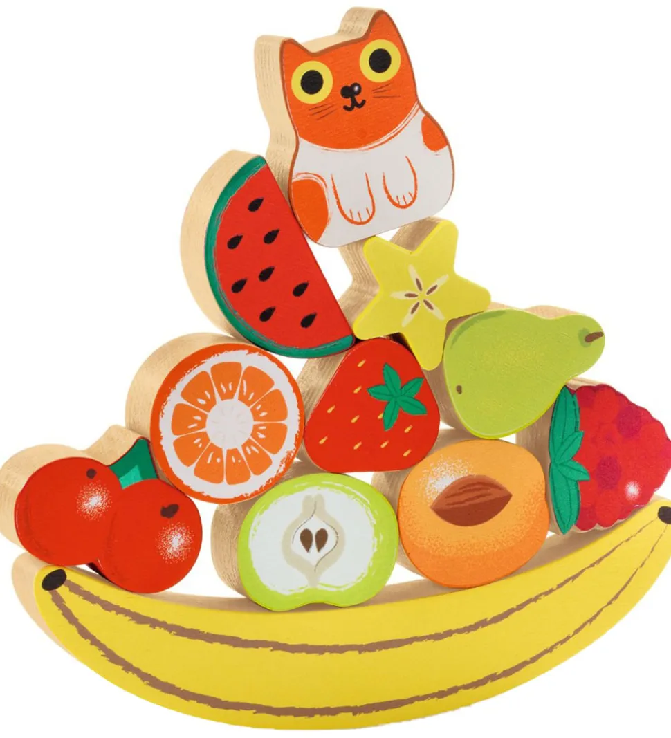 Djeco puslepillet har 11 brikker og består af en firkantet plade med fordybninger, som brikkerne passer ned i. Hver brik stikker op over kanten af pladen, så det er let for det lille barn at gribe fat om brikkere. Bananen kan vippe fra side til side, og bruges som en ekstra lille leg hvor man skal balancere de andre brikker ovenpå.