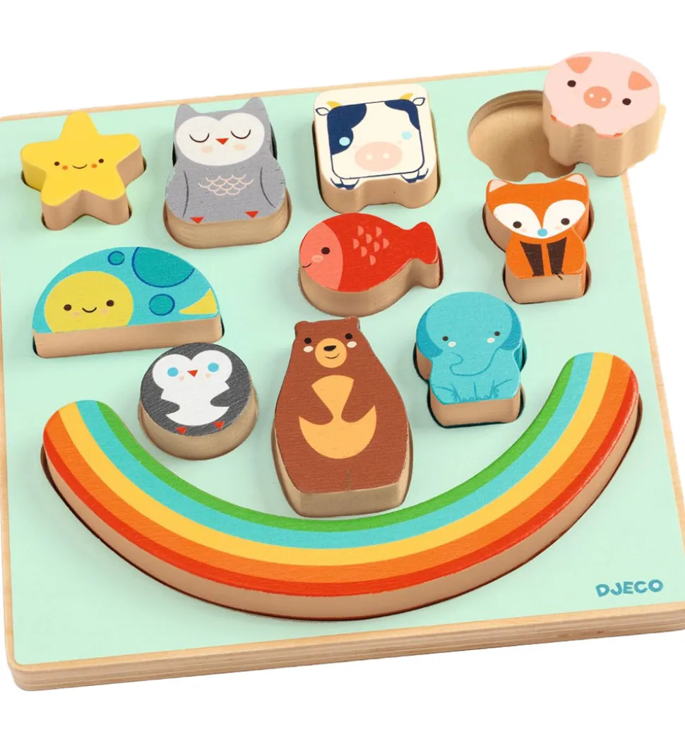 Sjovt Djeco puslepil af træ, med motiver af forskellige dyr og en regnbue.