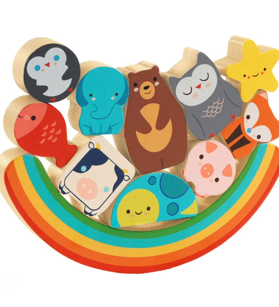 Djeco puslepillet har 11 brikker og består af en firkantet plade med fordybninger, som brikkerne passer ned i. Hver brik stikker op over kanten af pladen, så det er let for det lille barn at gribe fat om brikkere. Regnbuen kan vippe fra side til side, og bruges som en ekstra lille leg hvor man skal balancere de andre brikker ovenpå.