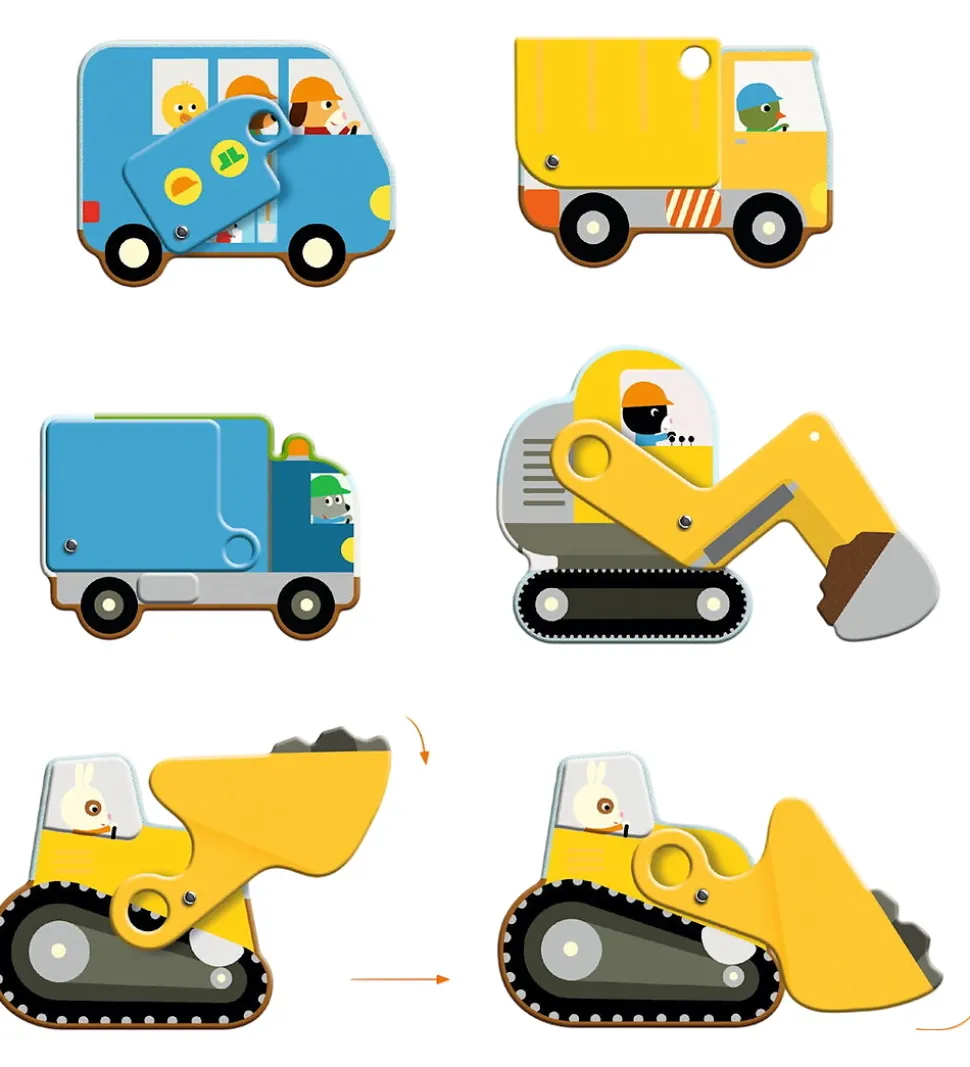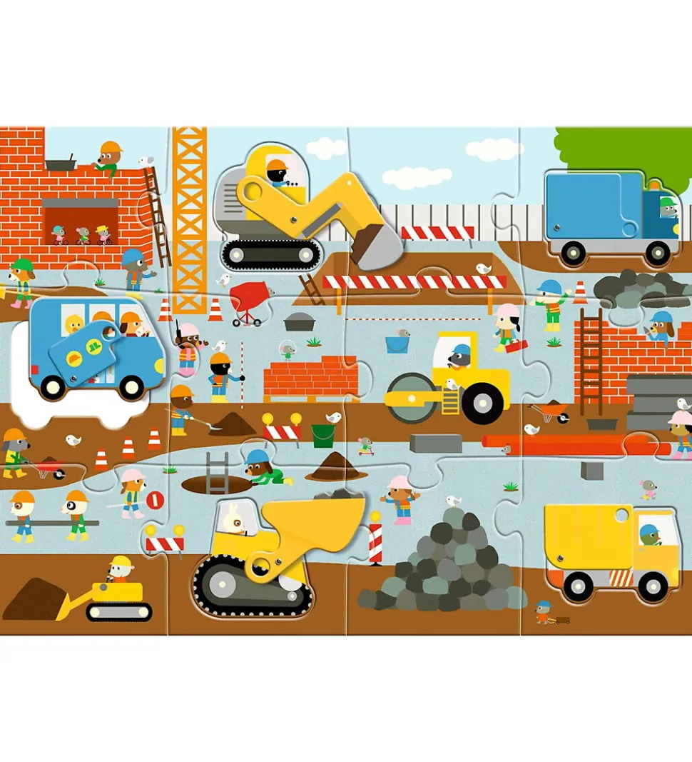 Farverigt Djeco puslespil med byggeplads-tema af 17 brikker. Detaljerede illustrationer i kraftige farver som blå, gul og rød bringer sjov til legen. Djeco puslespillet fremmer kreativitet og hånd-øje-koordination hos børn.