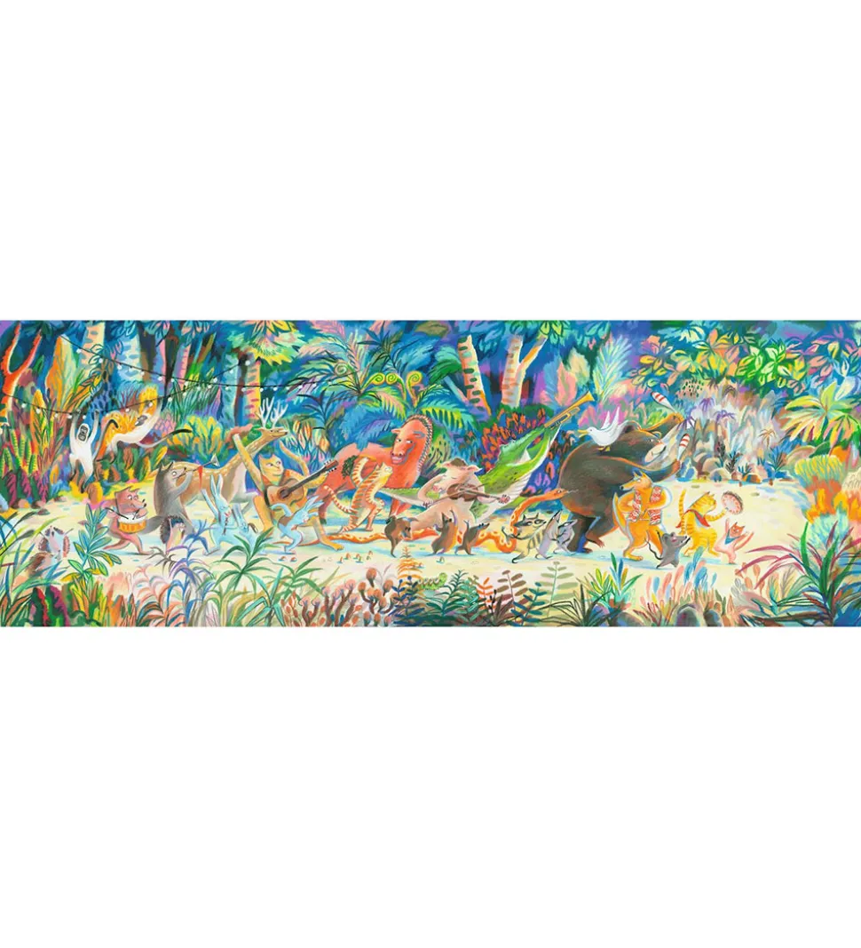 Kunstnerisk Djeco puslespil med motiv af en farverig jungle med masser af dyr, som er malet af kunstneren Soyung Lee.