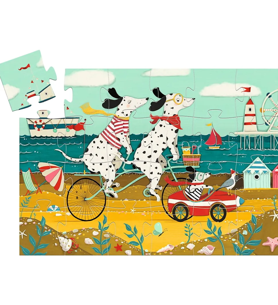 Flot Djeco puslespil med et motiv af en dalmatiner-familie på cykeltur.