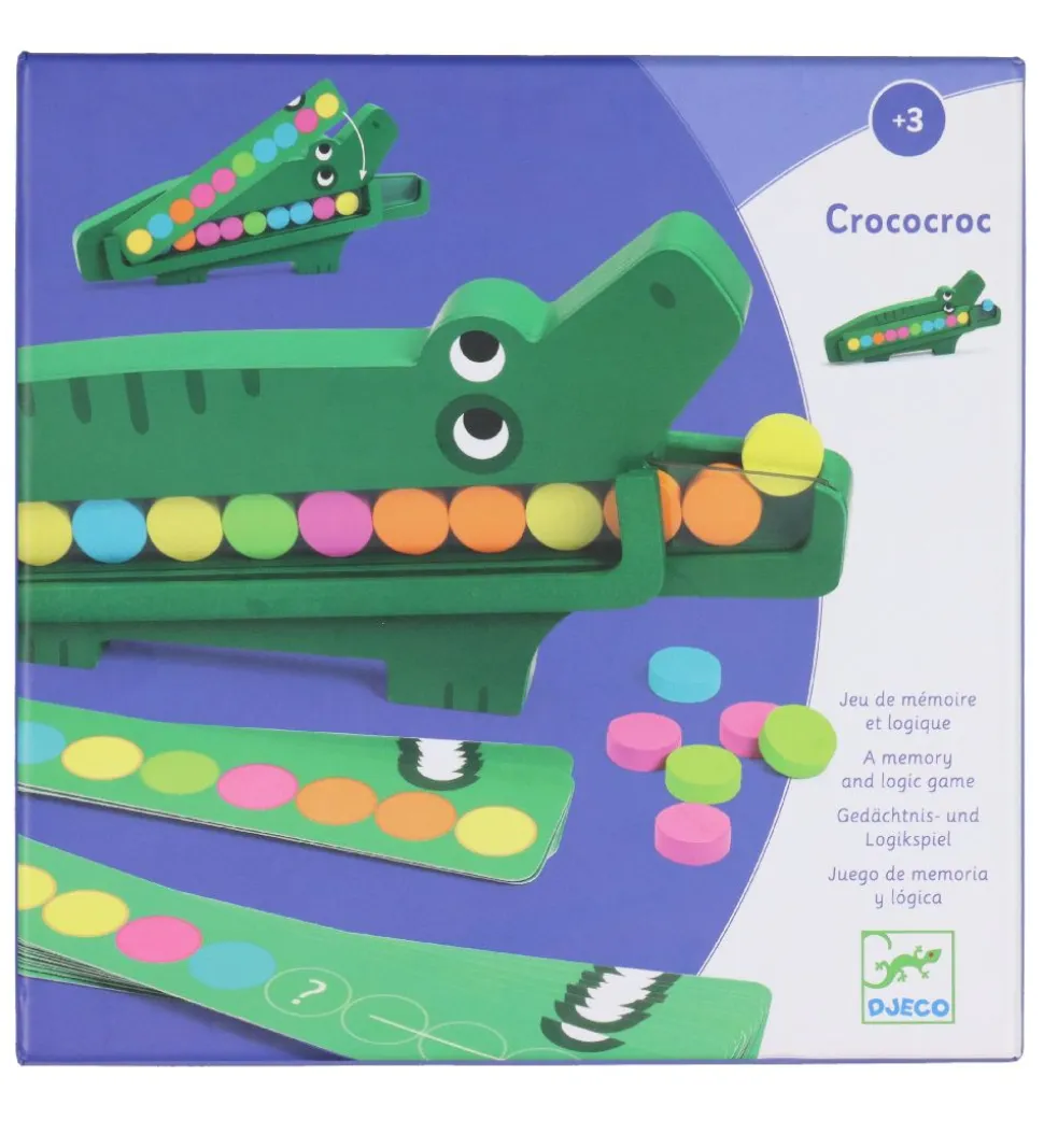 Djeco spillet er et sjovt og pædagogisk spil, hvor man skal bruge sin logik og samtidig huske godt. Spillet gælder om at fodre krokodillen. Man skal sætte en spilleplade på krokodillen, og fodre krokodillen med brikkerne. Derfter kan der tjekkes, om man har fodret den rigtigt.