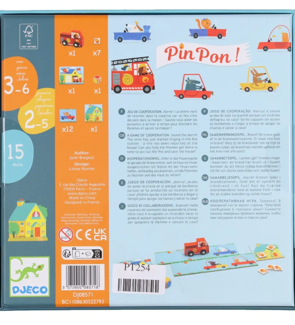 Djeco spillet består af 12 dobbeltsidede kort med billeder en vejbane, der enten er fri eller spærret af en bil. Nu gælder det om på skift at slå med terningen og sørge for at der er fri bane for brandbilen til at nå fra brandstationen og frem til det brændende hus, inden det er for sent.