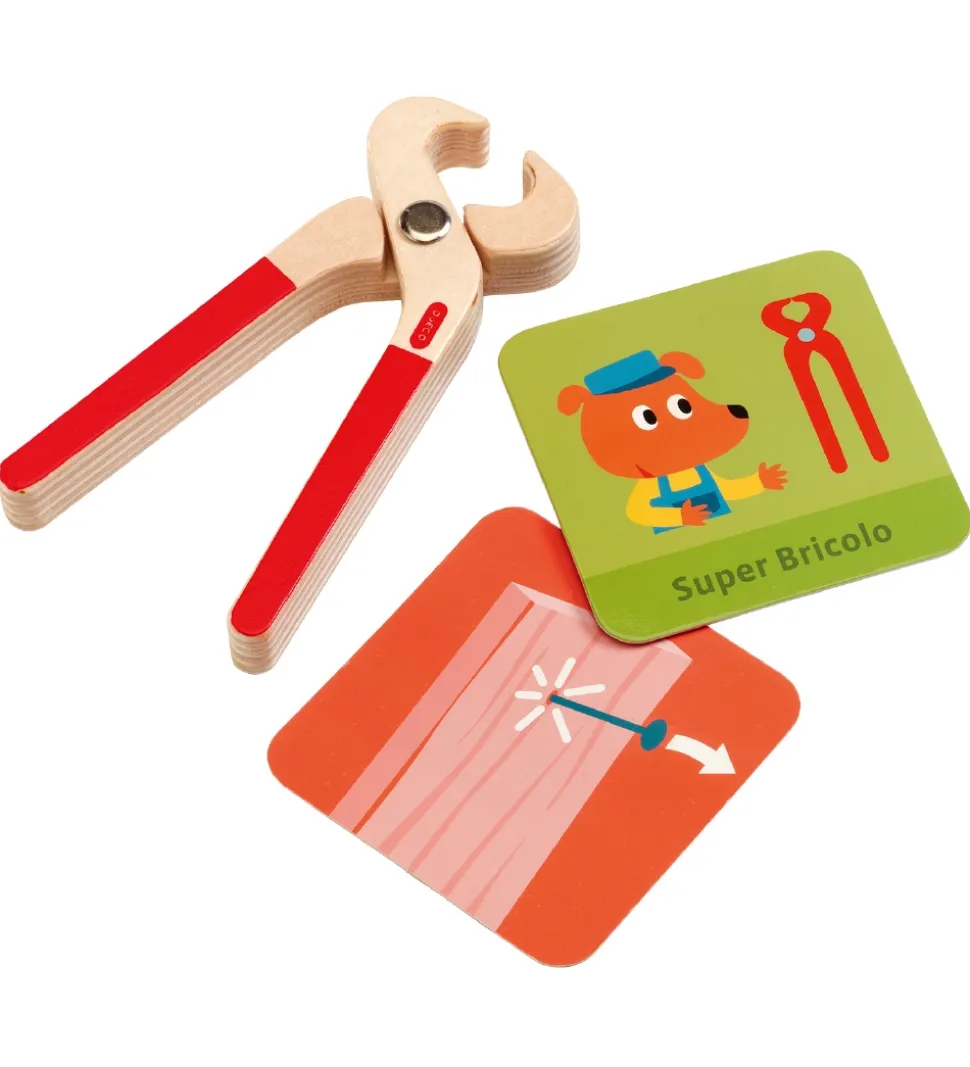 Djeco værktøjskassen med bærehåndtag kommer med følgende værktøj: