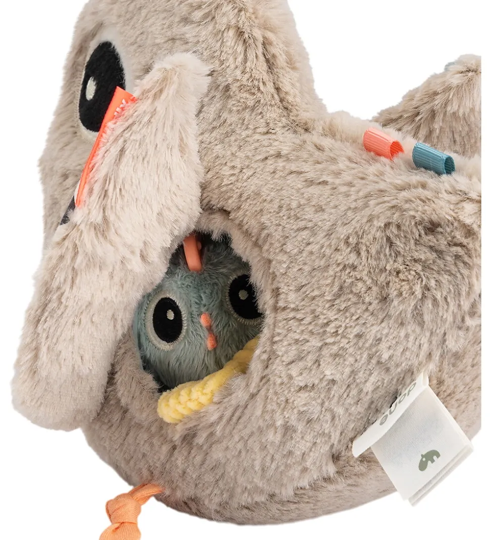 Sødt Done by Deer aktivitetslegetøj bestående af en fugl i beige plys med en prikket vinge og en grøn vinge. Vingerne siger knitrende lyde når man rører ved dem. Bag den ene vinge gemmer sig et spejl, mens der bag den anden vinge gemmer sig en gul og en blå fugleunge med forskellige strukturer. Den gule unge siger en raslelyd når man ryster den.