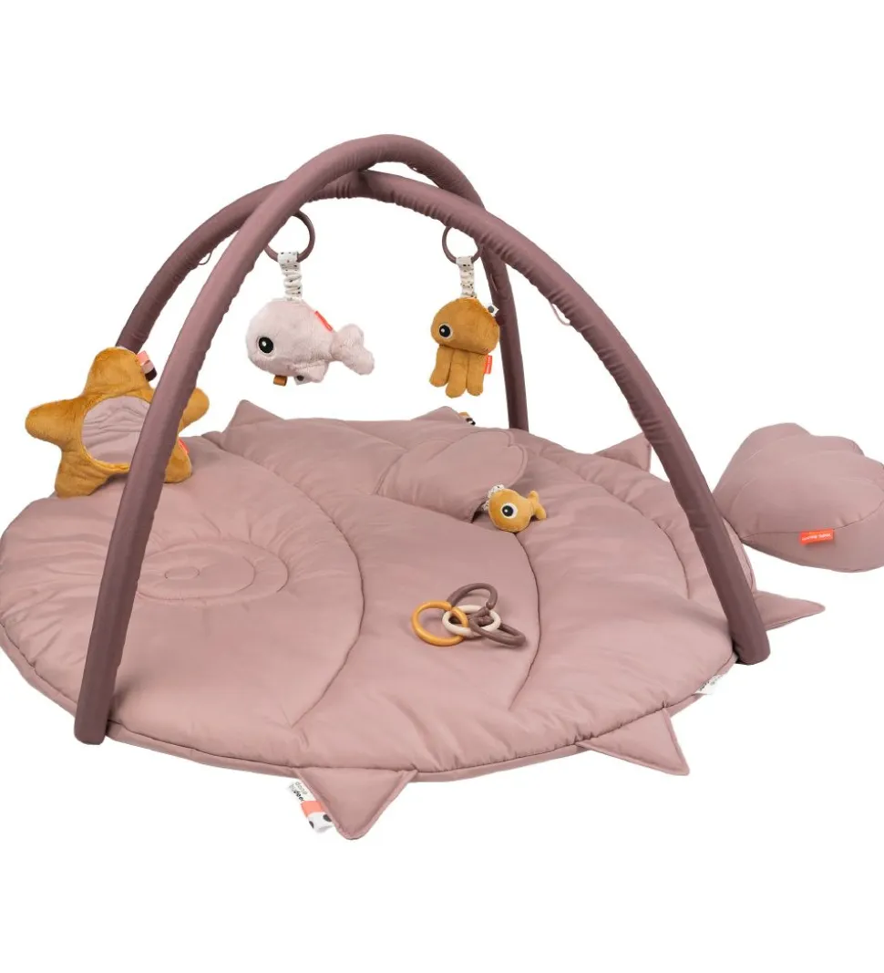 Tæppet er designet som en sød fisk med finner, der fungerer som nulreflapper og en enkelt som støttepude. Tæppet er utrolig blødt og tykt med et quiltet design, så barnet ligger behageligt. Til tæppet medfølger der 5 forskellige havdyr i form af aktivitetslegetøj, der stimulerer barnets sanser. Aktivitetslegetøjet hænges på stativet med de medfølgende C-ringe.
