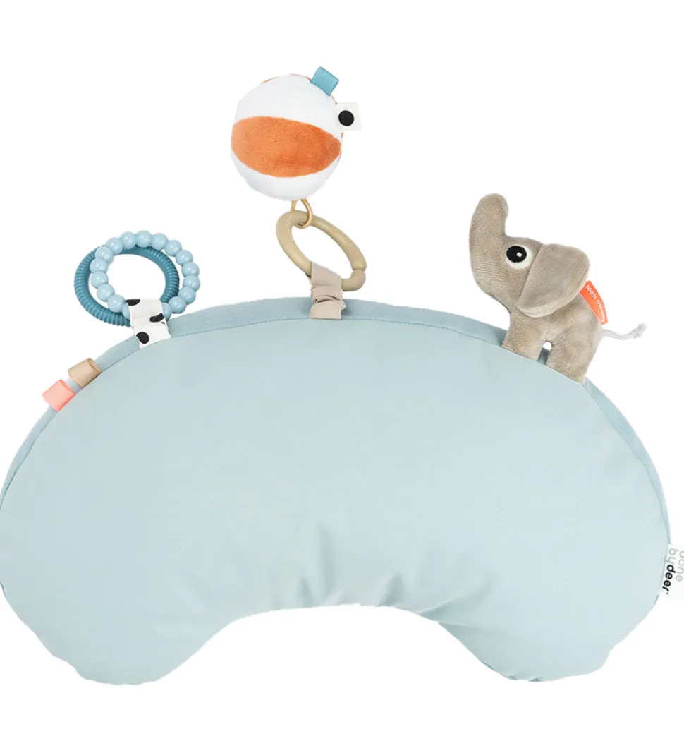 Done by Deer puden med aktivitetslegetøj er perfekt til, når barnet skal ligge på maven og træne at kigge op, da aktivitetslegetøjet er sjovt at undersøge. Der er tre forskellige stykker aktivitetslegetøj, som stimulerer sanserne ved lyd såsom klokke og knitrepapir, og som kan bides i og undersøges med hænderne.