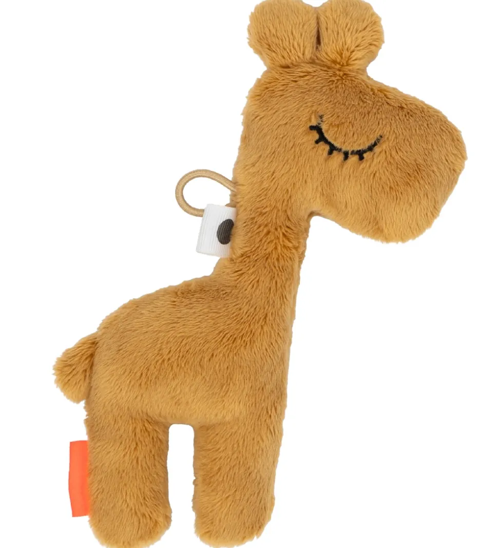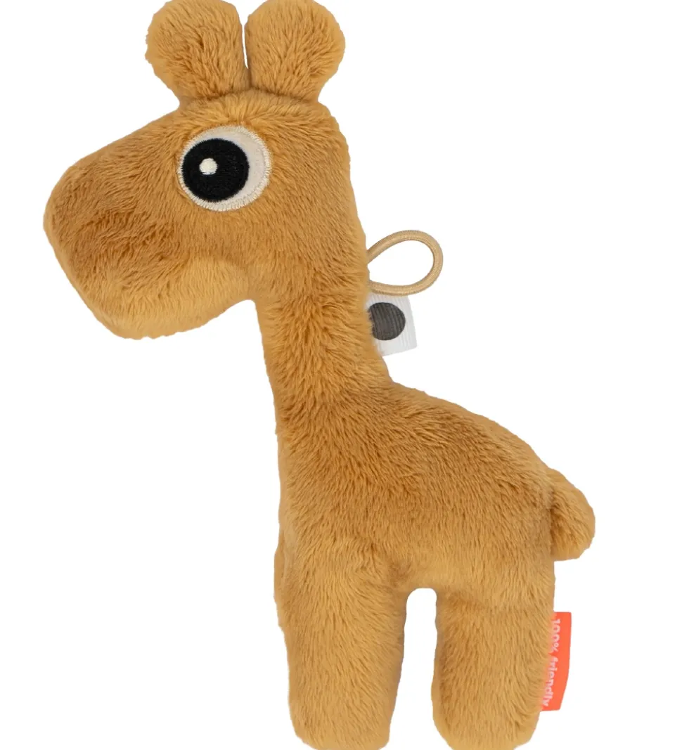 Done By Deer ranglen har en bjælde indeni, som ringer, når barnet leger med den. Ranglen er lavet i et blødt materiale, og giraffens ene side har papir på indersiden, som siger en knitrelyd, når man rører ved den. Ranglen har en elastisk hank, så den kan hænges op på f.eks. et aktivitetsstativ eller i barnevognen.
