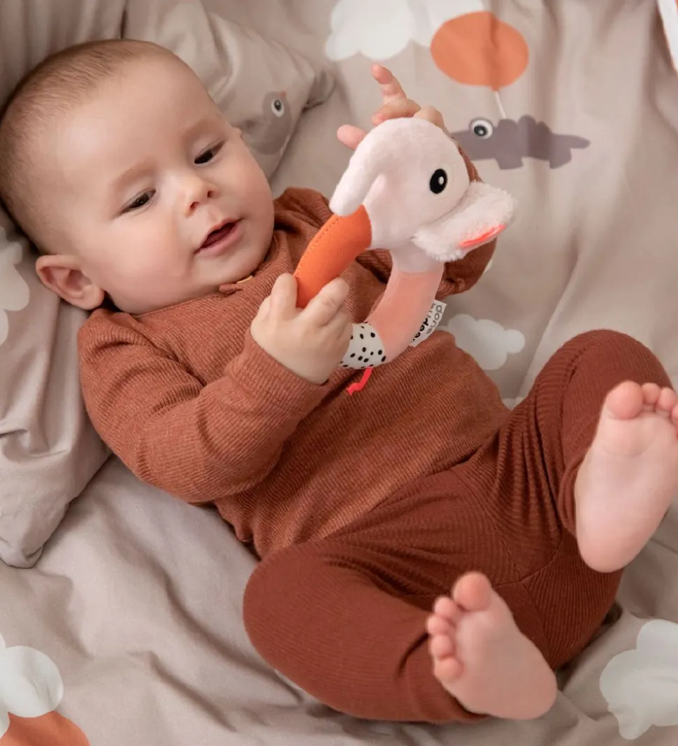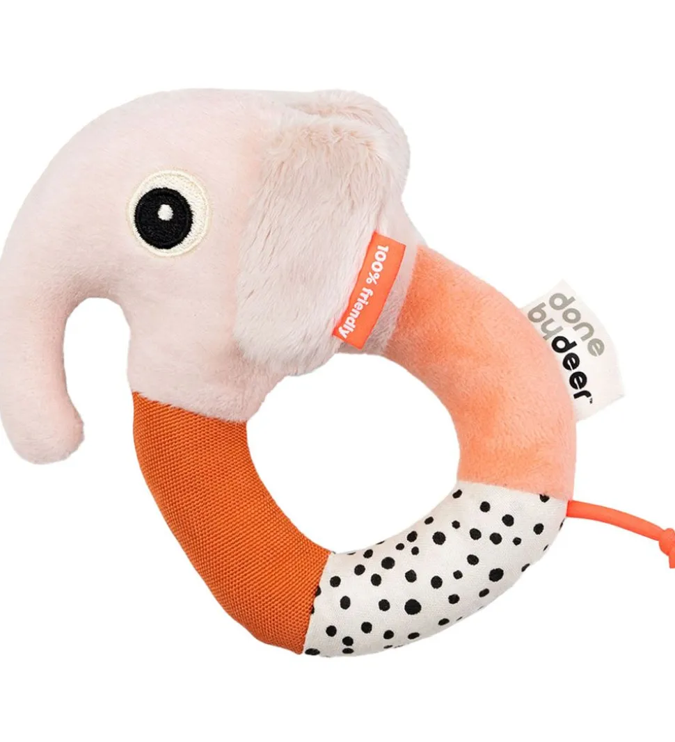 Done by Deer ranglen er med papir indvendigt, som laver en spændende lyd når man rører ved elefantens ører. Ranglen passer perfekt ind i den lille barnehånd, og er det ideelle stykke legetøj til barnet der øver sig i at gribe.