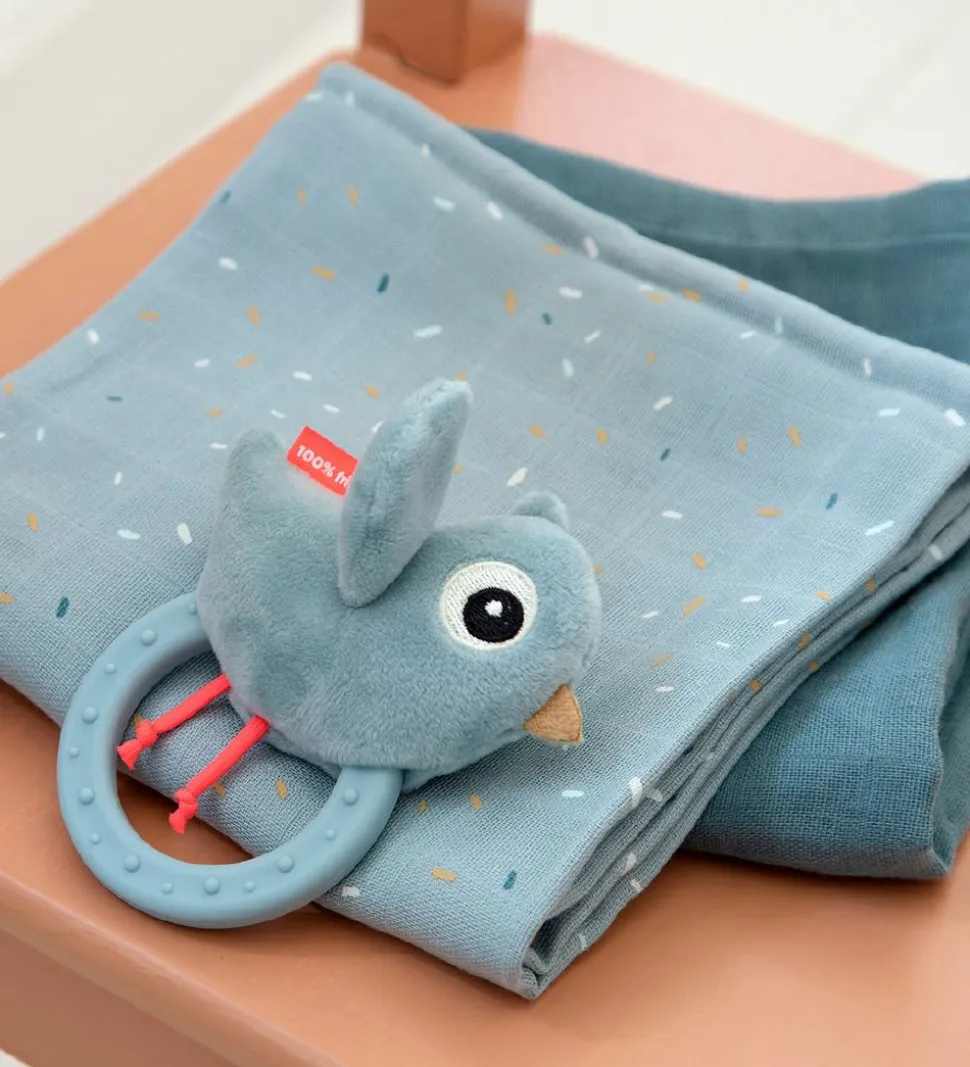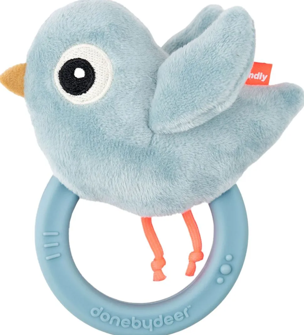 Done by Deer ranglen består af en gummiring og lille bamse med papir indvendigt, som laver en spændende lyd når man rører ved fuglen. Gummiringen passer perfekt ind i den lille barnehånd, og er det ideelle stykke legetøj til barnet der øver sig i at gribe.