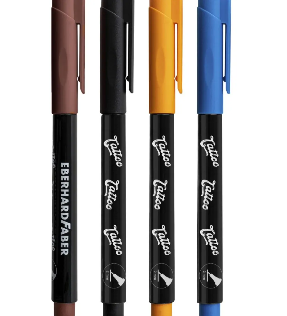 Fine Eberhard Faber Tattoo tuscher solgt i en 4-pak i sort, orange, blå og brun.