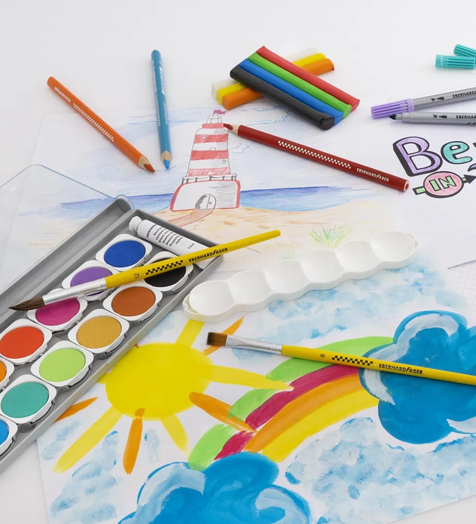 Eberhard Faber vandfarverne kommer i en praktisk plastikbakke, hvor der også er plads til at lægge en pensel. Med de mange farver er det kun fantasien, der sætter grænser. Den store æske gør det let at pakke sammen og transportere.