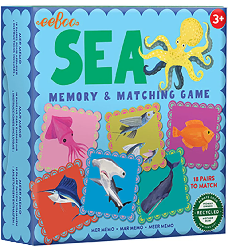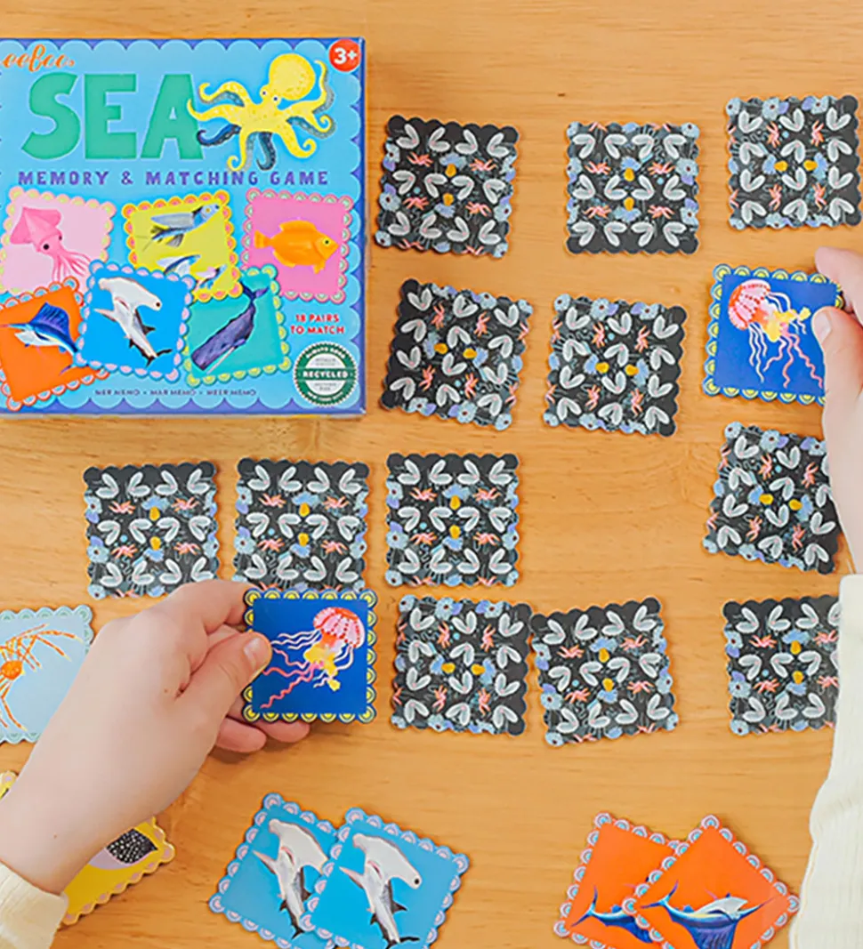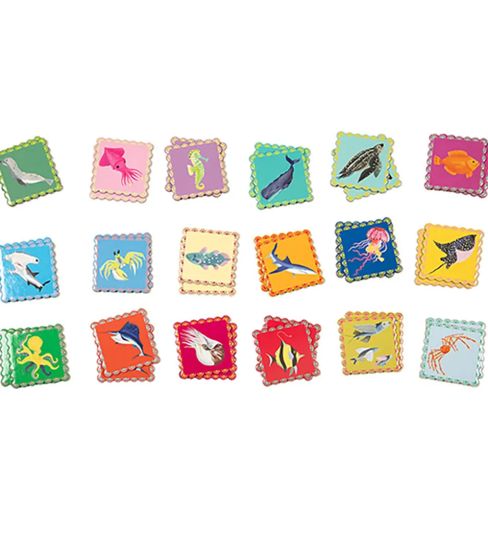 Sjovt Eeboo huskespil, bestående af 36 brikker á 18 par, som alle er med motiv af havdyr.