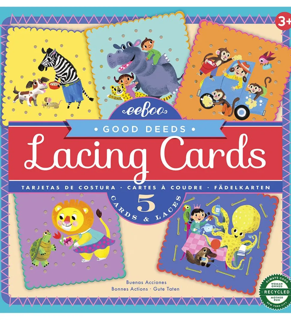 Sjovt Eeboo læringsspil med kort i flotte farver med dyr og mennesker, der udfører gode gerninger.