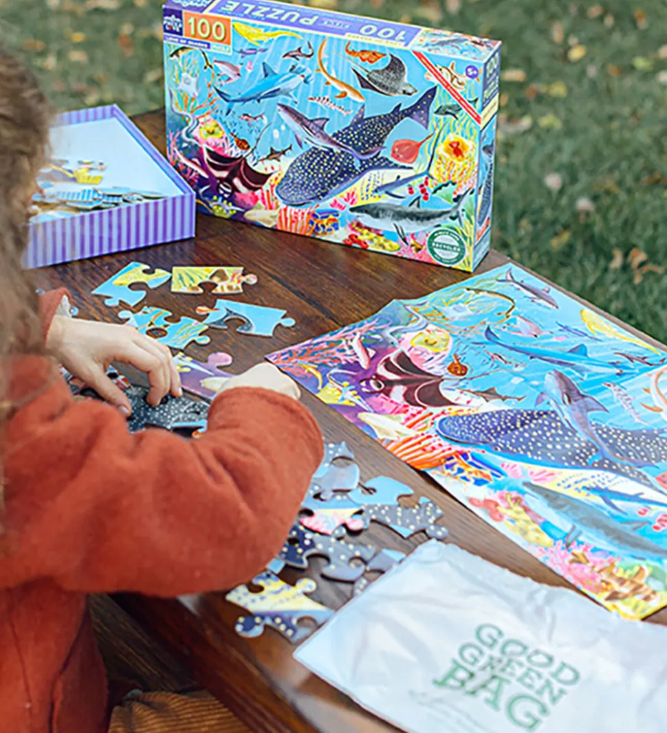 Flot Eeboo puslespil med motiv af et hav fyldt af hajer. Der medfølger en informativ plakat.
