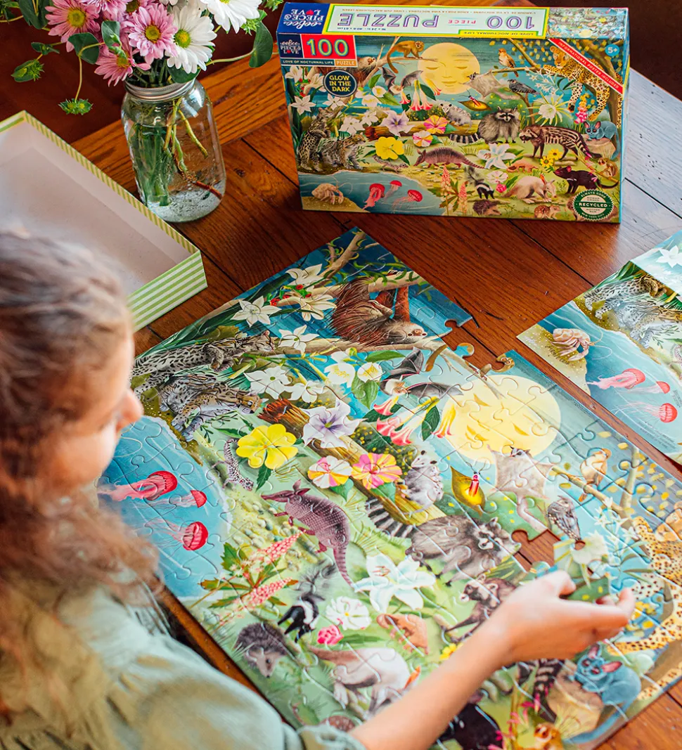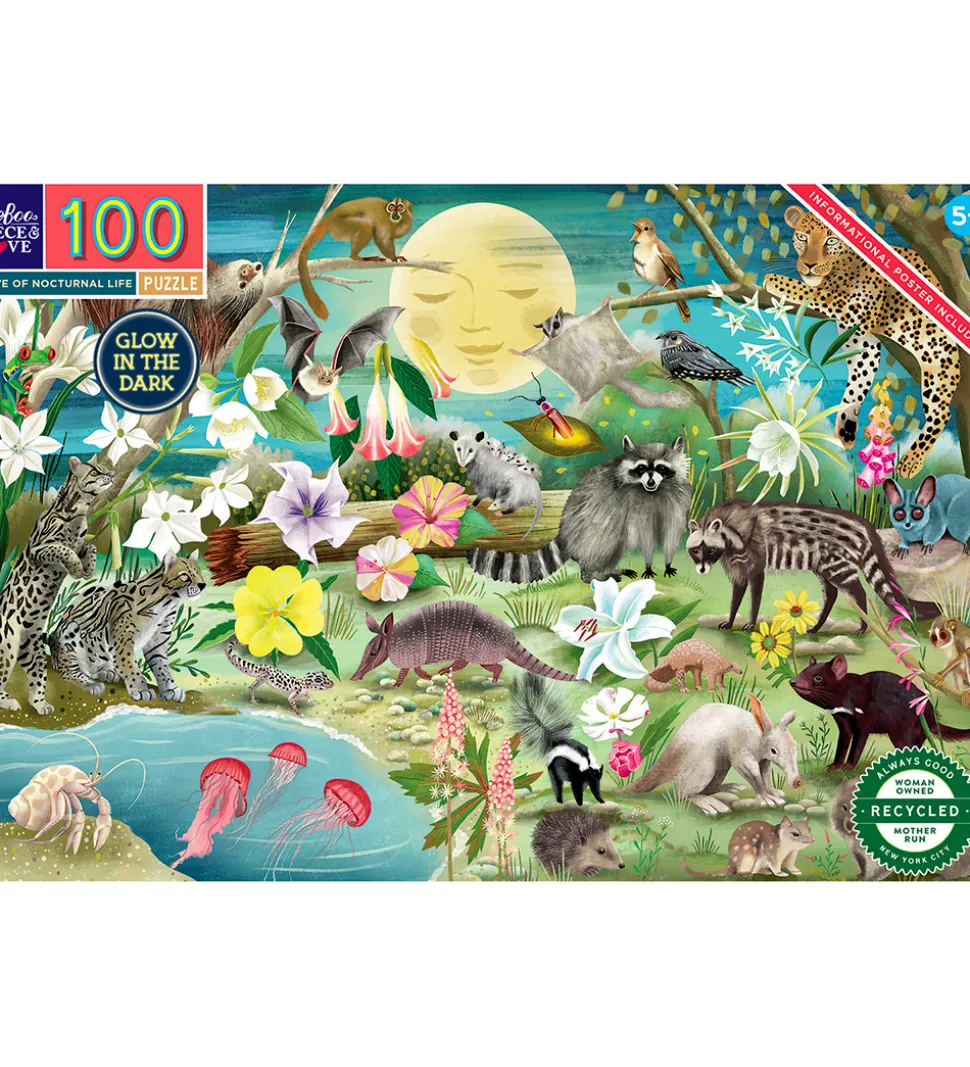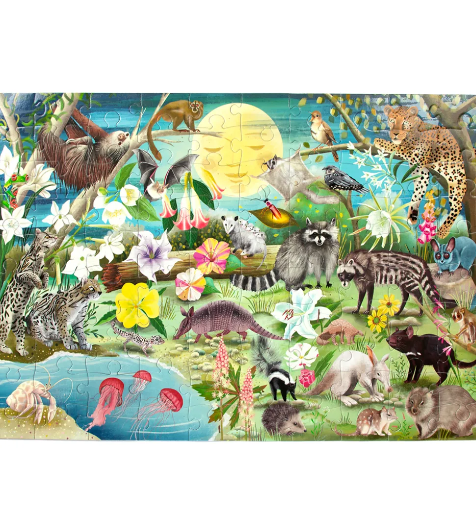 Hyggeligt Eeboo puslespil som forestiller nattens dyr og blomster.