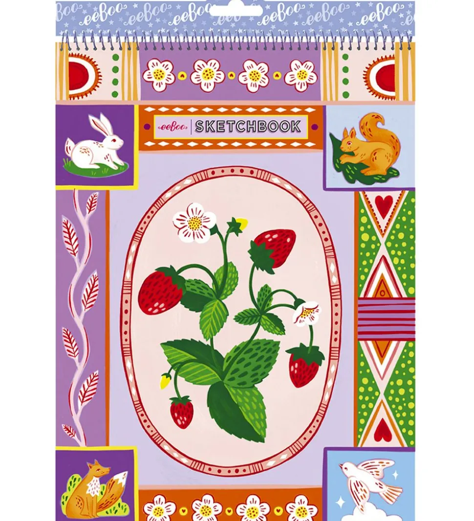 Fin Eeboo skitseblok med et forsidecover i en masse fine farver. I midten er der jordbær, og rundt omkring er der dyr og planter.