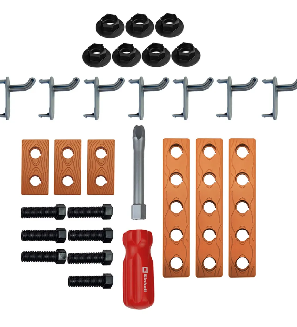 Praktisk Einhell værktøjsbænk i rød og sort med et smart design. Værktøjsbænken kan slåes sammen som en kuffert. Når den er slået ud, har barnet adgang til det medfølgende værktøj og tilbehør, som har sin egen plads.