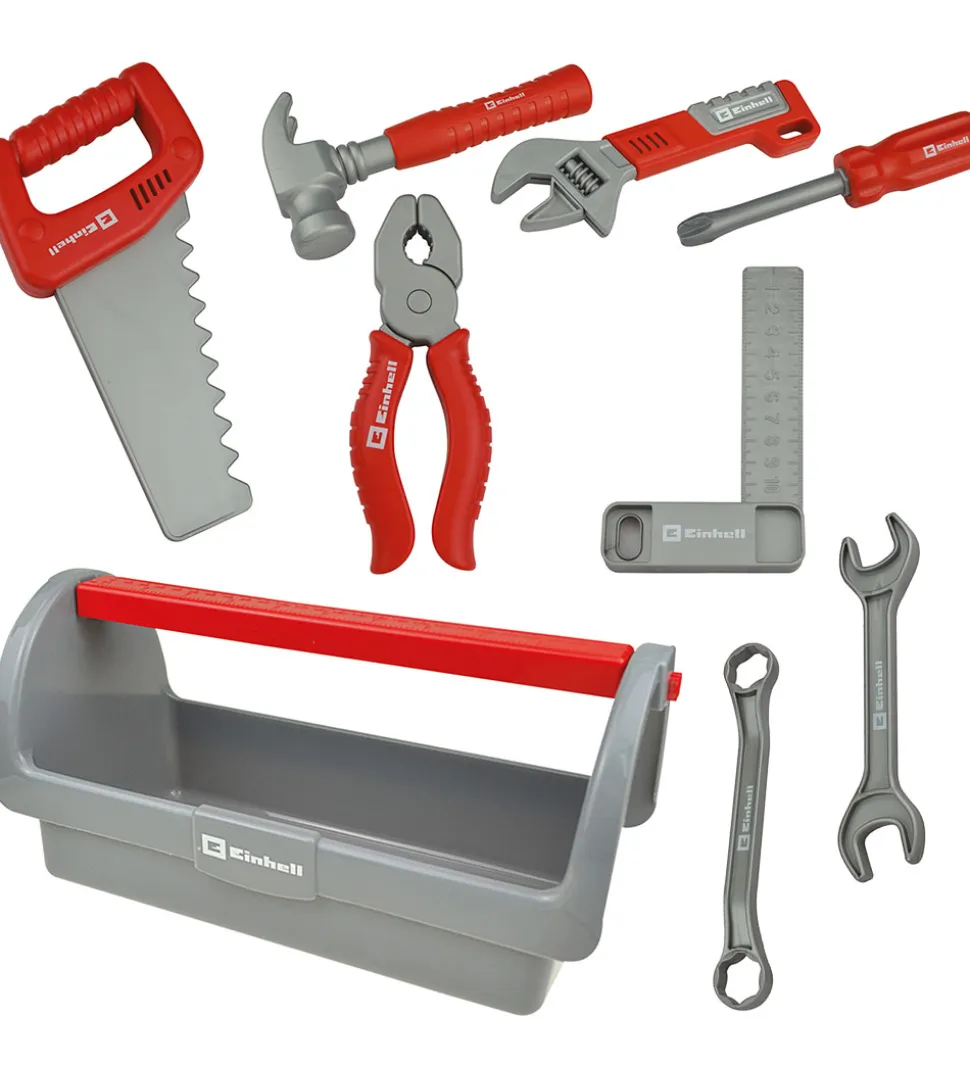 Smart Einhell værktøjskasse i grå med flotte røde detaljer. Sættet inkluderer forskellige værktøjer som: