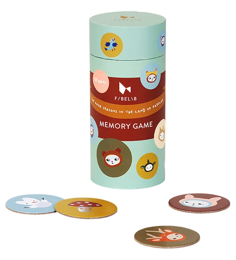 Fabelab vendespillet består af 18 forskellige par formet som cirkler, der sætter børnenes hukommelse på prøve. Brikkerne blandes og spredes ud med motivet nedad, og herefter går jagten efter ens par i gang. Brikkerne er i pap og kommer i en praktisk cylinderformet æske.