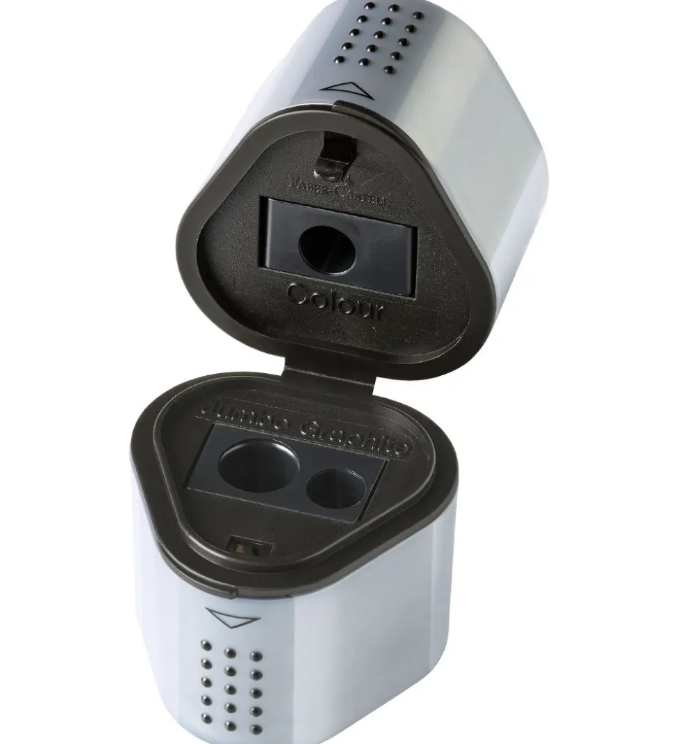 Faber-Castell blyantspidseren gør det nemt og praktisk at spidse blyanter, farveblyanter og jumbo blyanter. Blyantspidseren åbnes midt på, hvilket afslører tre huller i forskellige størrelser. Når blyantspidseren skal tømmes, tages de sølv dele af og tømmes let.