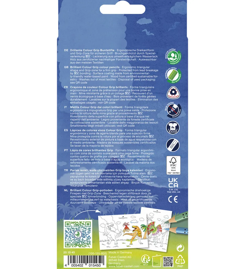 Faber-Castell farveblyanterne har en ergonomisk, trekantet form. Farveblyanterne er i smukke, vandopløselige farver og har en miljøvenlig, vandbaseret lak og er beskyttet fra, at blyen knækker. Farve vaskes nemt af, hvis det kommer på tøjet. Træet er fra bæredygtige træer.
