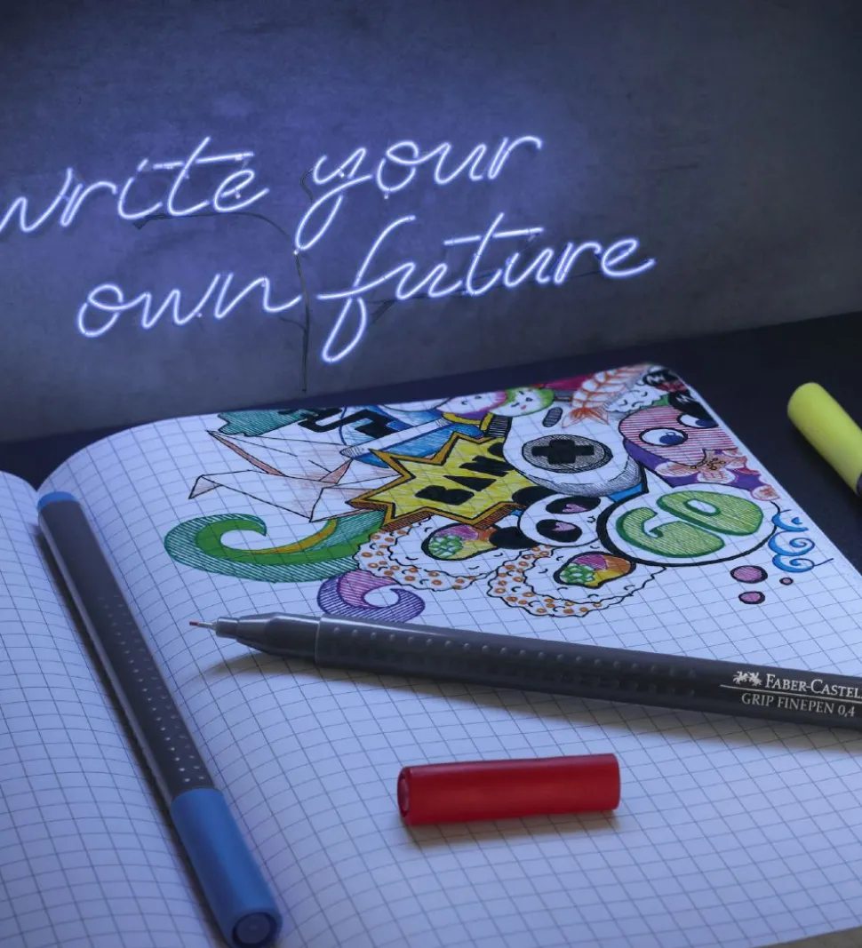 Faber-Castell tuscherne har en ergonomisk, trekantet form med praktiske knopper på stiftet som giver et godt greb. Tuscherne har en meget fin tip på 0,4 mm, så man kan tegne mange små detaljer. Farven vaskes let ud af de fleste tekstiler, da de er baseret på madfarver.