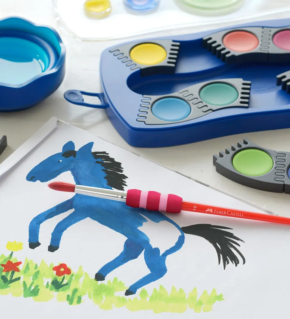 Skønt Faber-Castell vandfarve i 12 farver, med en medfølgende pensel og tube med hvid maling.