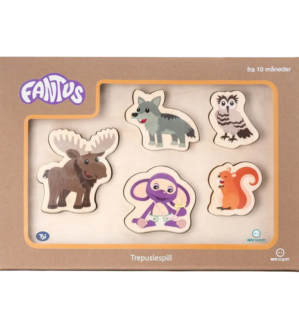 Fine Fantorangen & Fantus puslespil af træ og med 5 brikker i et “dyrene i skoven”-tema.