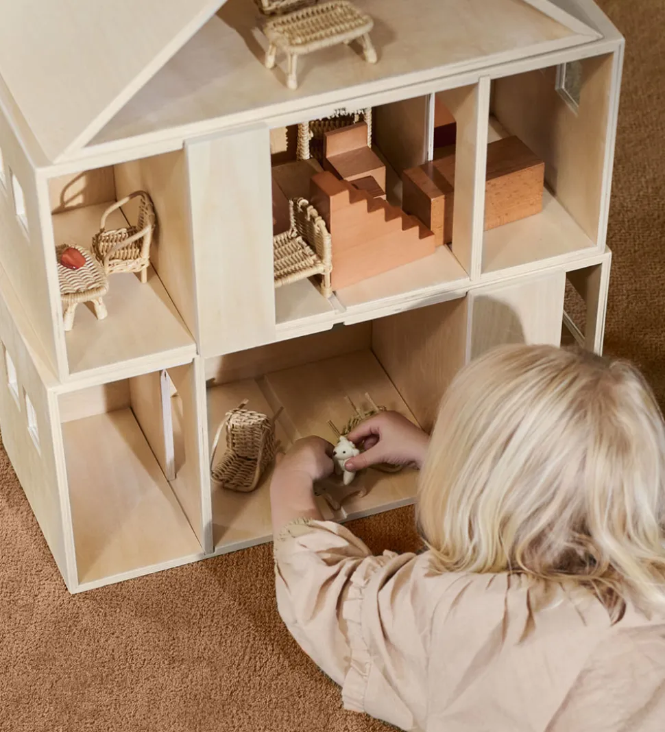 ferm Living dukkehuset består af flere dele, som gør det muligt at opbygge dukkehuset på forskellige måder. Det består af tre hovedkomponenter i form af to rektangulære og en trekantet enhed. Der medfølger rumdelere, som kan skubbes og sættes ind forskellige steder i dukkehuset, samt små træfigurer som forestiller forskellige møbler. Dukkehuset indbyder til kreativitet når der skal stables og indrettes.