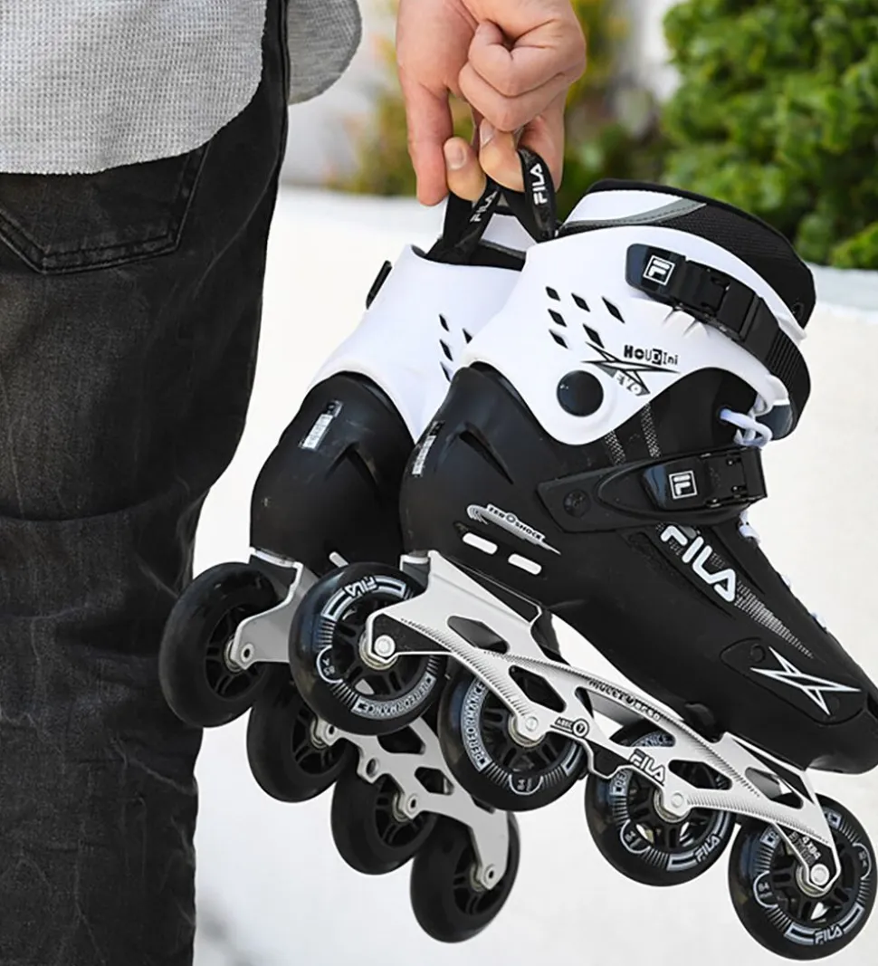 Smarte Fila rulleskøjter i sort med detaljer i hvid og reflekterende sølv.