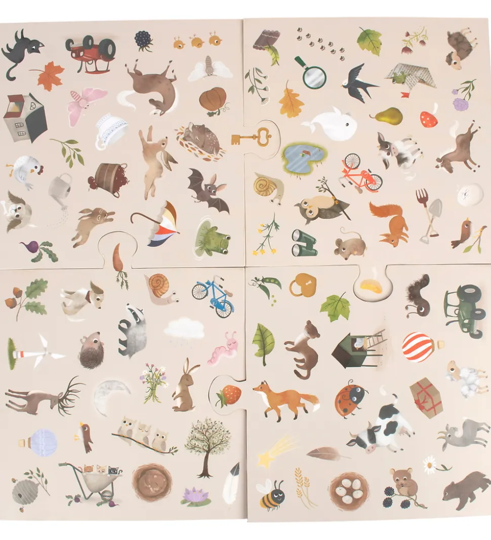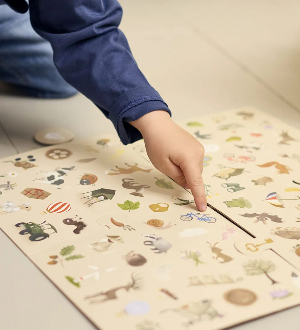 Farverigt Filibabba brætspil bestående af 100 farverige illustrationer. Brætspillet består af fire brikker, som sættes sammen og udgør spillepladen. Spillet går ud på at trække en brik, og være den første til at finde det samme motiv på spillepladen. Den der til sidst har fundet flest motiver har vundet spillet.