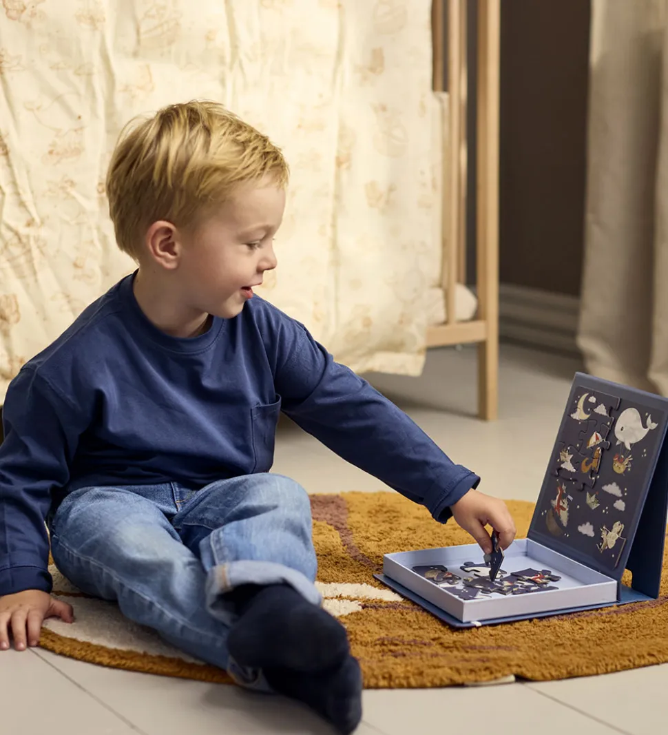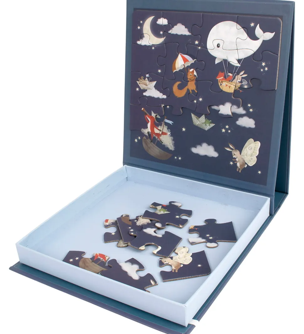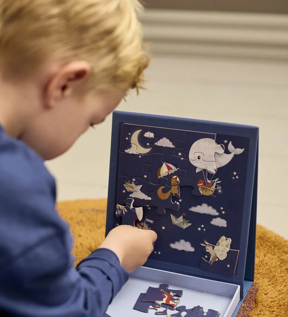 Underholdende Filibabba magnetisk puslespil bestående af en mørkeblå æske med drømmende tema. Æsken indeholder 20 magnetiske puslespilsbrikker med skønne motiver, heriblandt et svævende egern, en luftballon formet som en hval og en måne. Puslespillet kan samles og sættes fast på indersiden af æsken.