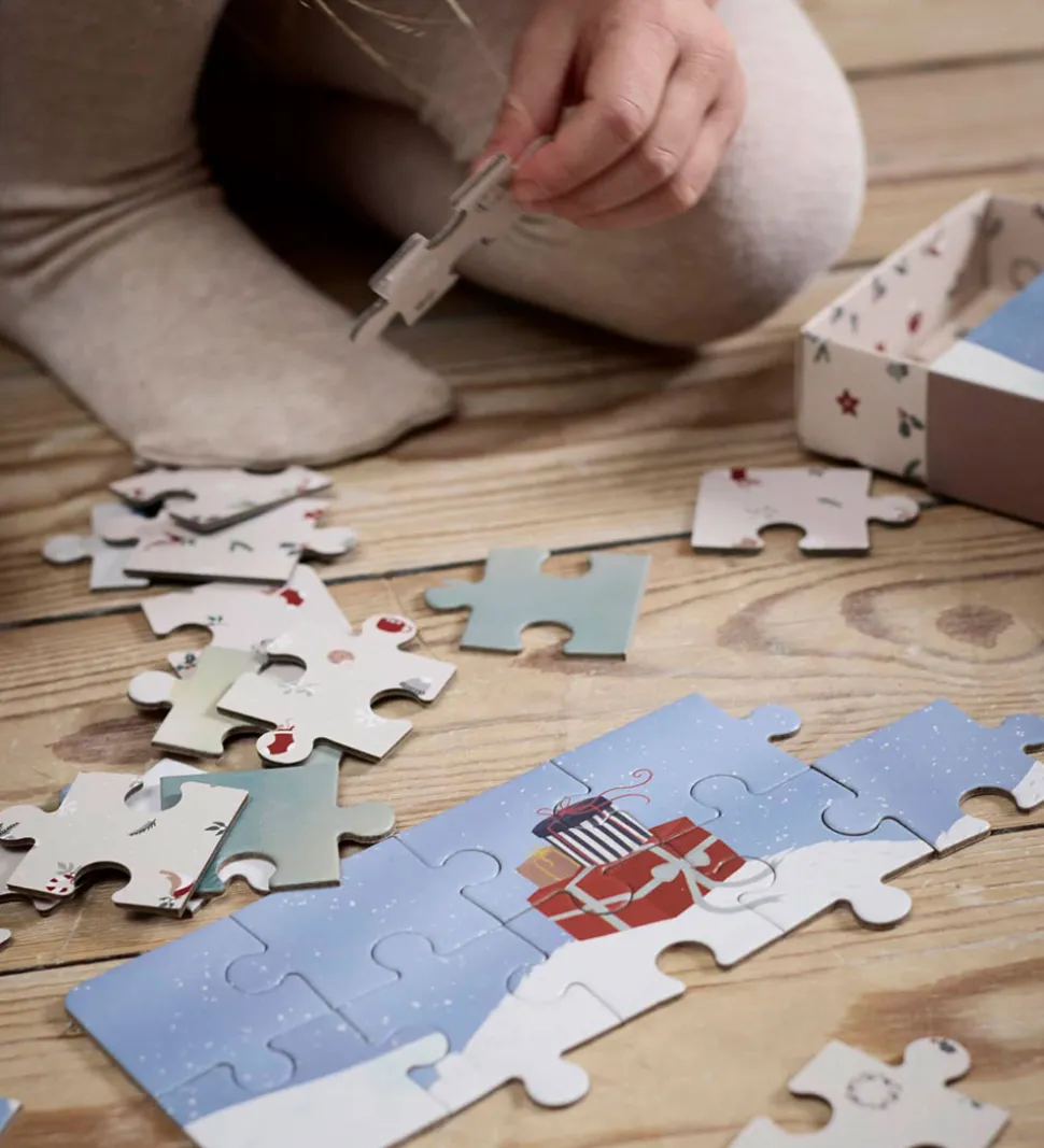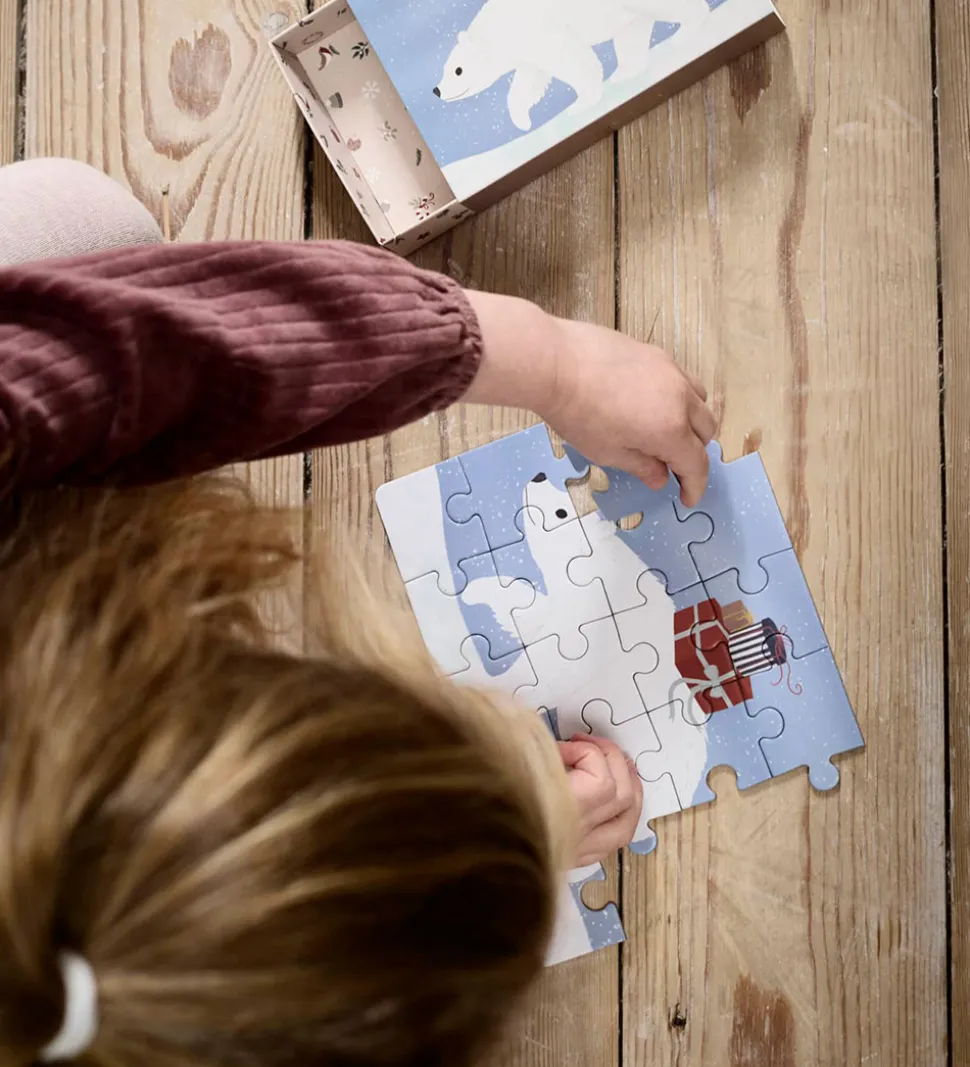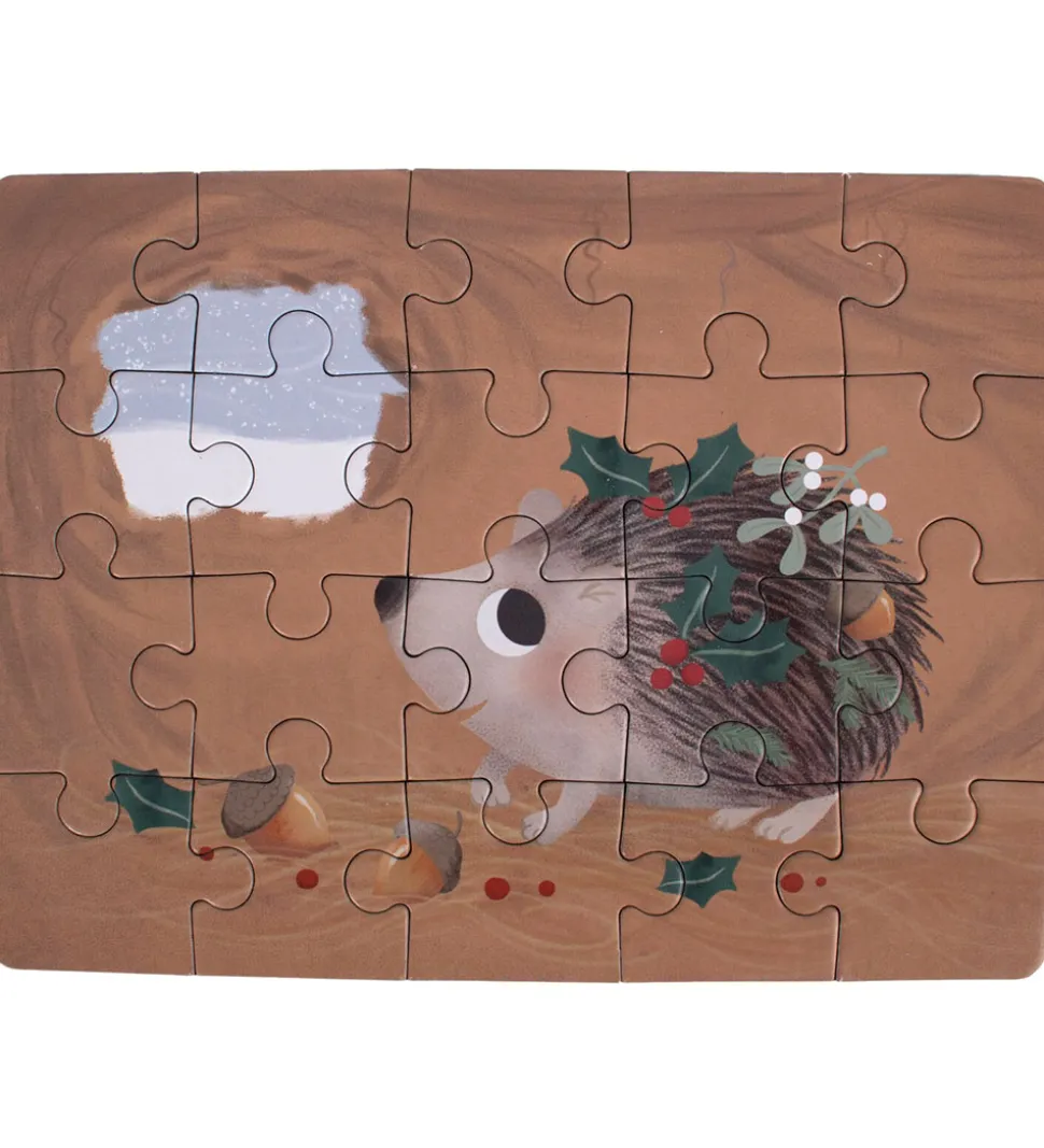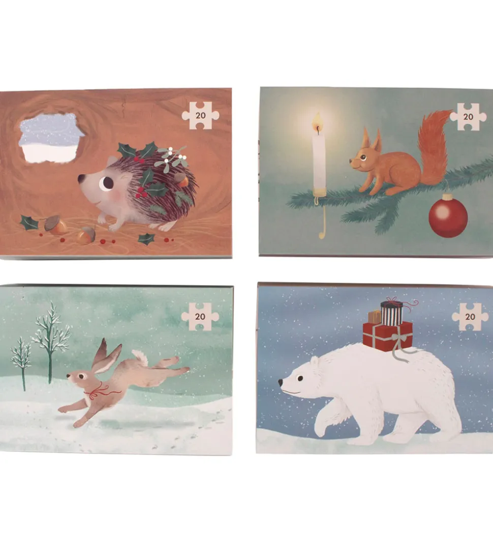 Hyggelige Filibabba puslespil i et sæt med fire puslespil, der alle har et julemotiv og 20 brikker hver.