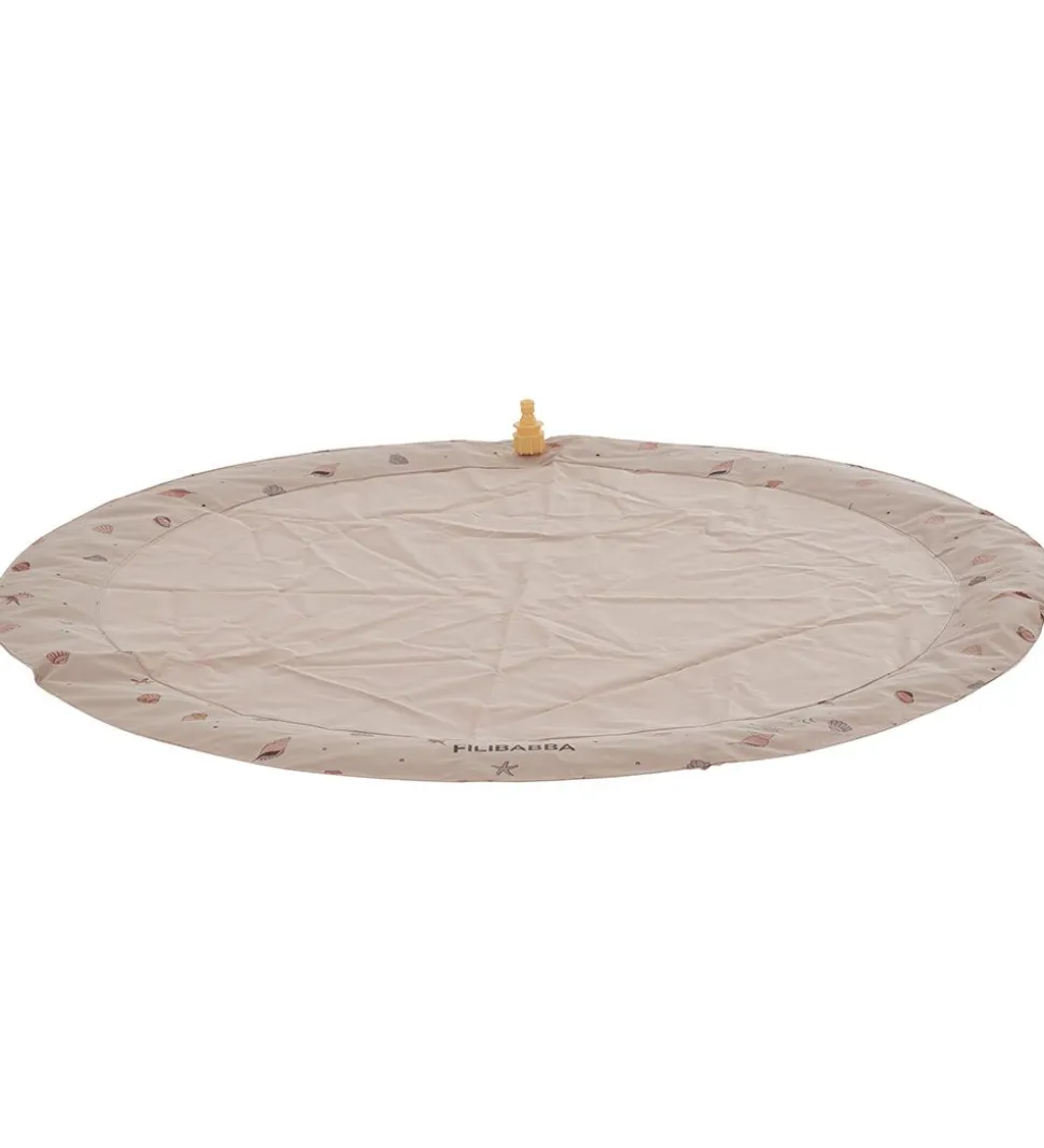 Sød Filibabba sprinkler i beige med et allover print af stjerner og muslinger i forskellige farver.