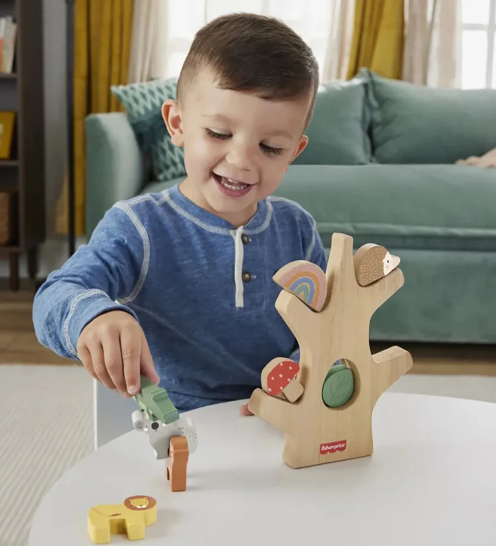 Flot Fisher-Price balancetræ i naturfarvet træ med farverige figurer, der forestiller forskellige vilde dyr, samt en svamp, et blad og en regnbue.