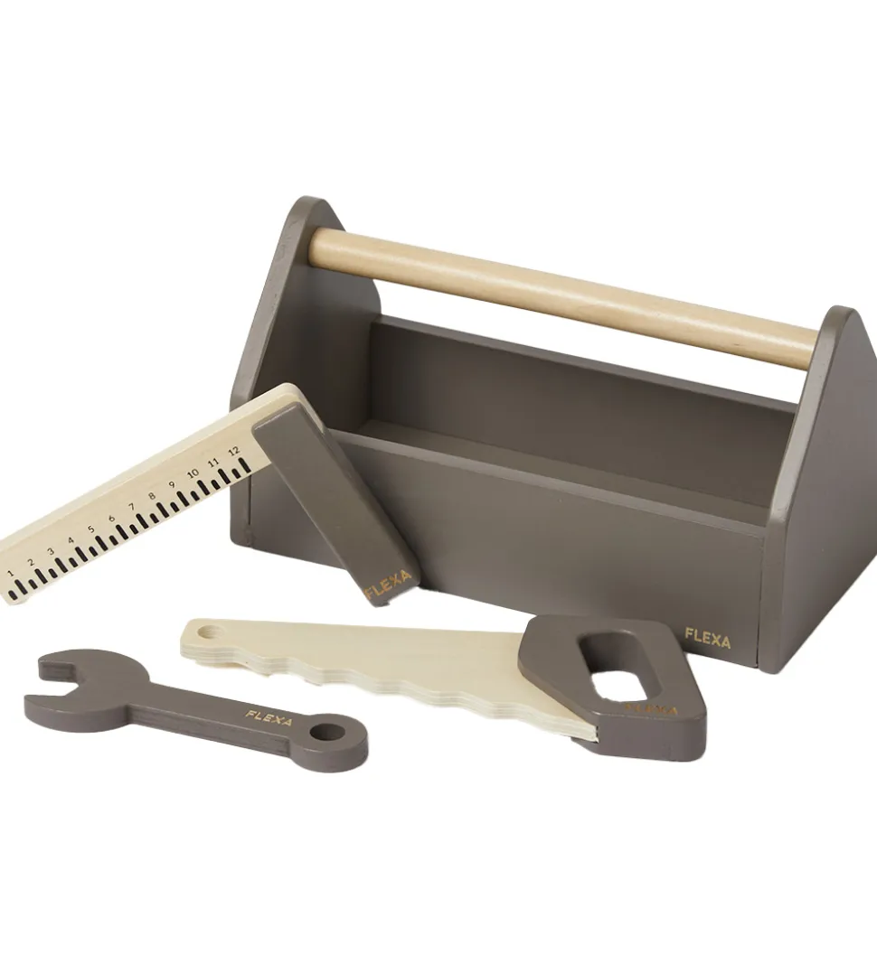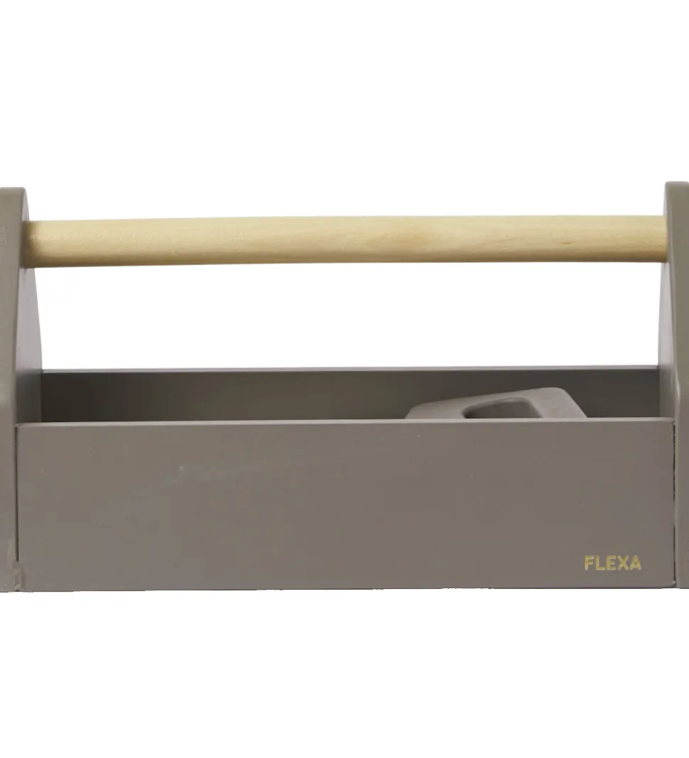 Hyggelig Flexa værktøjskasse med værktøj fra Play-kollektionen i massivt birketræ og birkekrydsfinér malet i støvet brun.