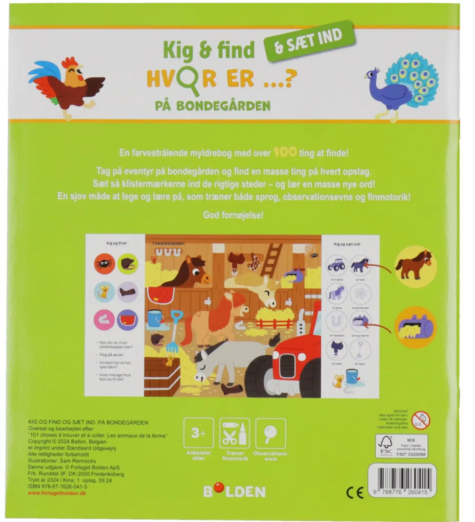 Spændende Bolden bog med titlen “Kig og find og sæt ind, hvor er…? på bondegården”.