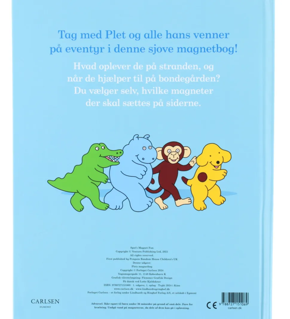 Forlaget Carlsen aktivitetsbogen rummer en historie om hunden Plet og venner på otte sider, som barnet kan interagere med, da der medfølger 10 magnet-figurer, som kan sættes ind i historien.