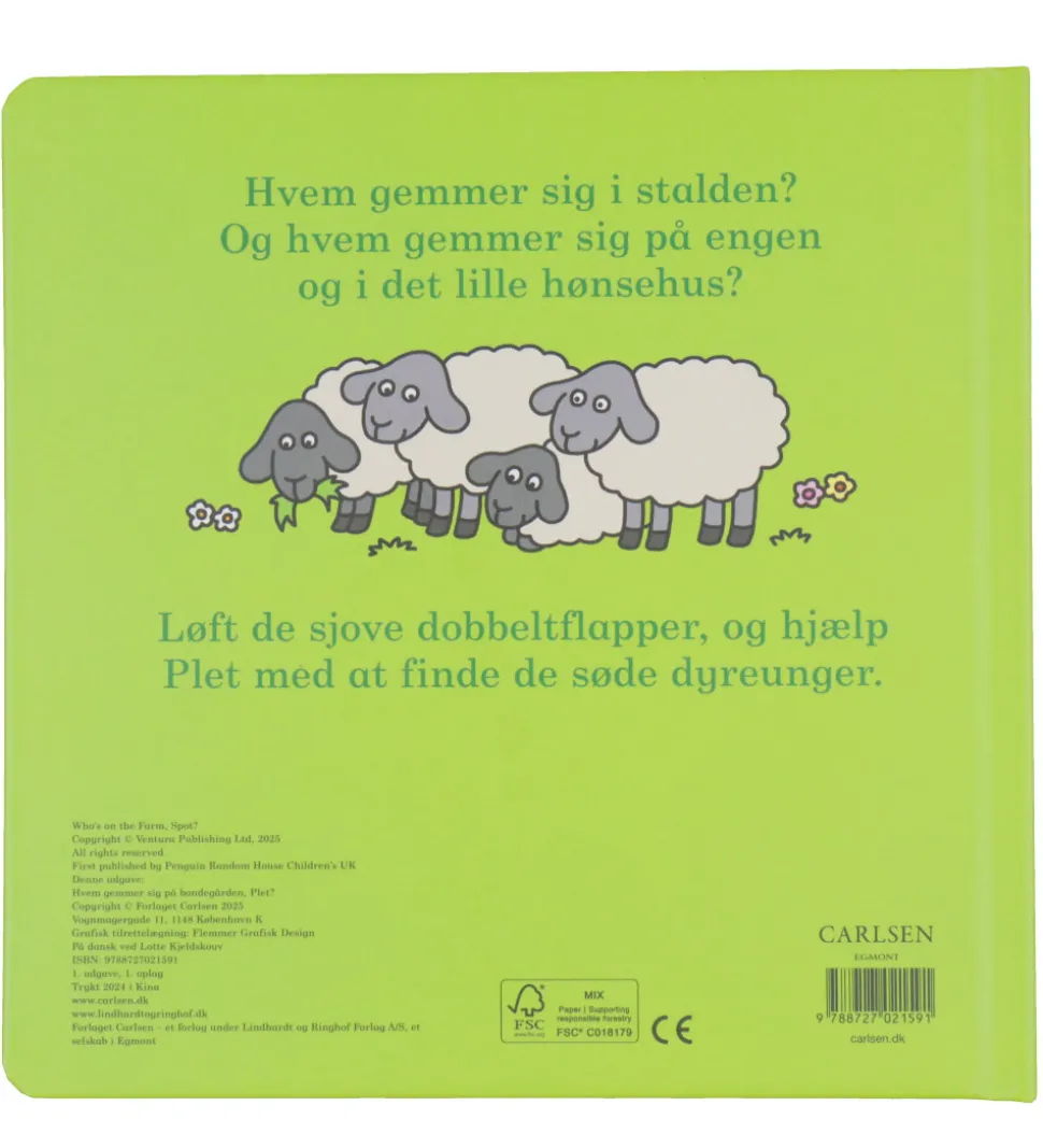 Fin Forlaget Carlsen bog med titlen “Hvem gemmer sig på bondegården, Plet?”.