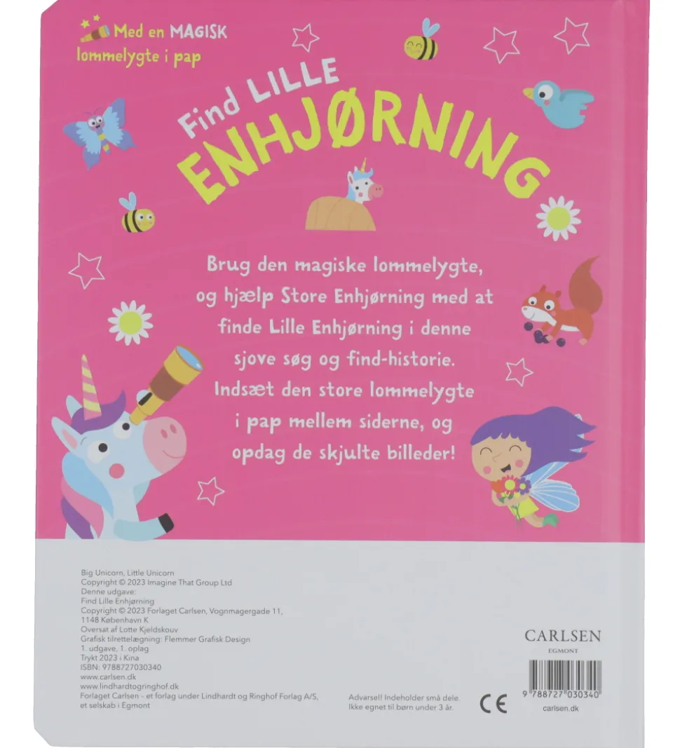Forlaget Carlsen bogen er sjov findebog, hvor barnet kan gå på opdagelse med den magiske lommelygte i pap og hjælpe Store enhjørning med at finde Lille enhjørning. Bogens sider er i kraftigt pap, så de tåler at blive vendt igen og igen.